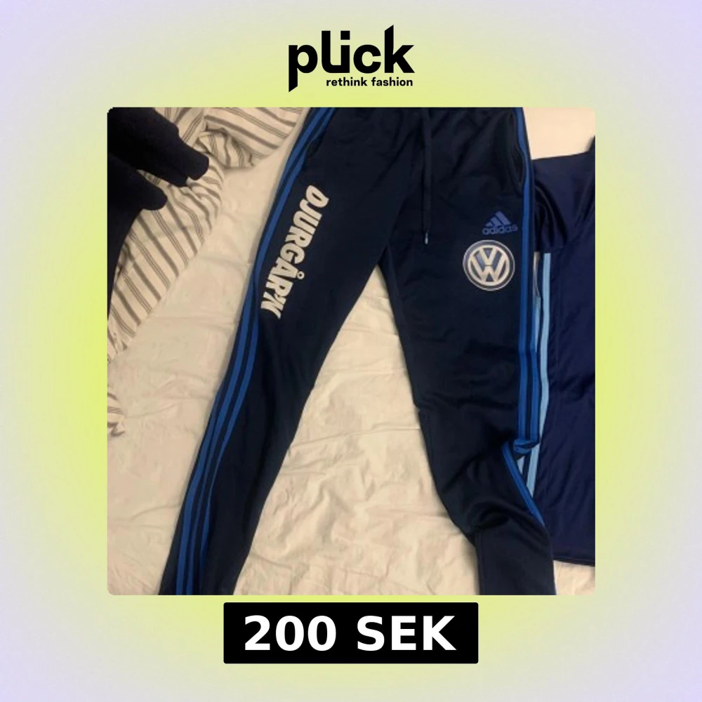 Mörkblå träningsbyxor från Adidas med Djurgården-tryck och Volkswagen-logga på ena benet. Byxorna har blå ränder längs sidorna och snörning i midjan. Perfekta för fotbollsträning eller chill.