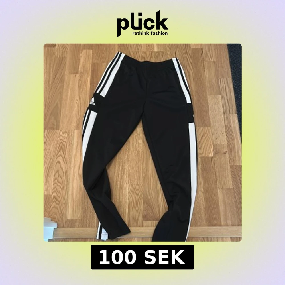 Säljer ett par svarta träningsbyxor från Adidas med vita ränder längs sidorna. Byxorna har en elastisk midja och är perfekta för sport och träning. De är tillverkade i ett syntetmaterial som ger bra rörlighet.
