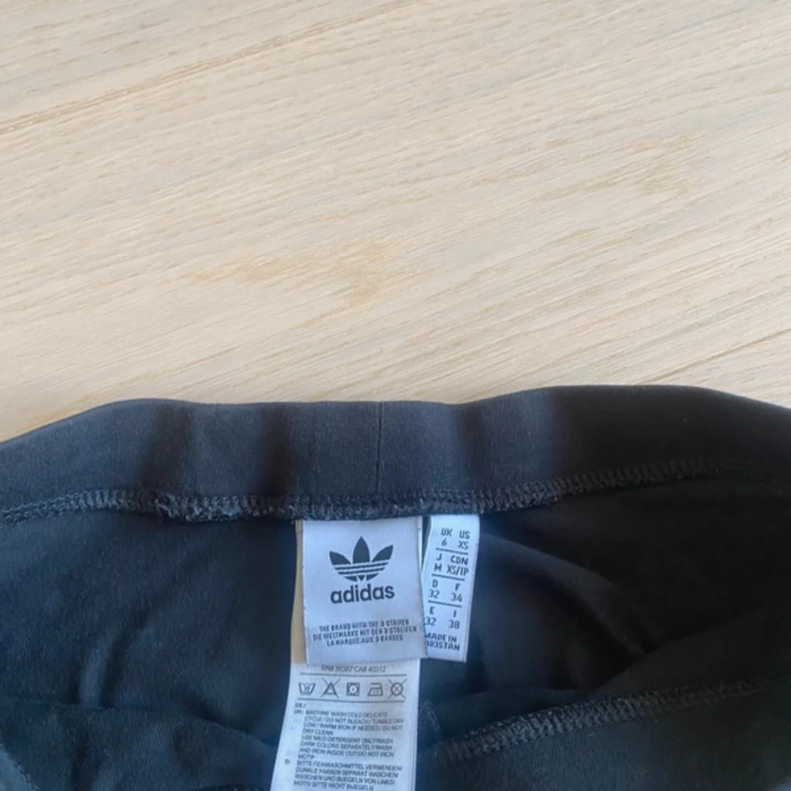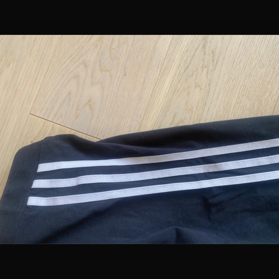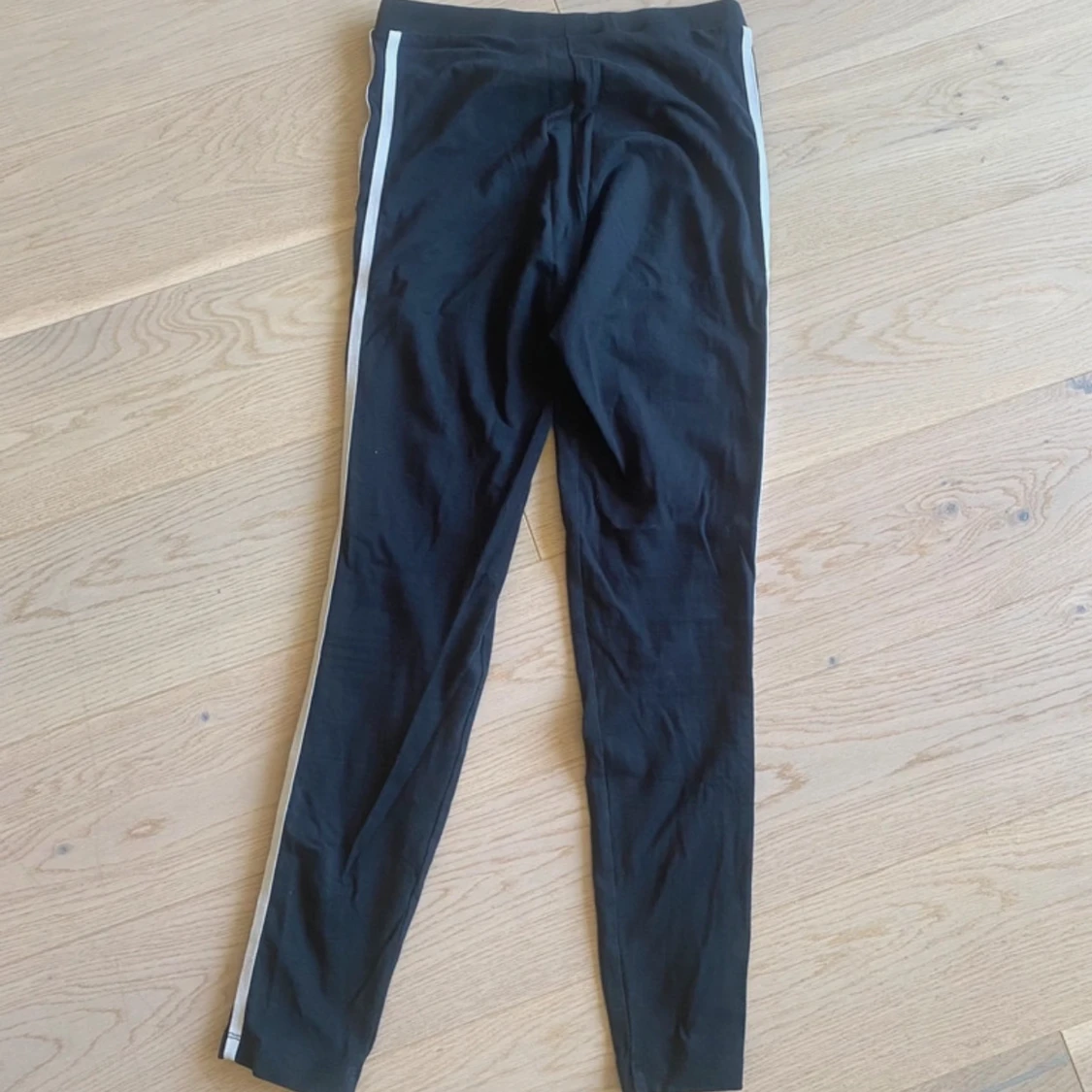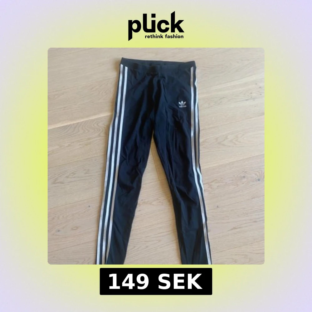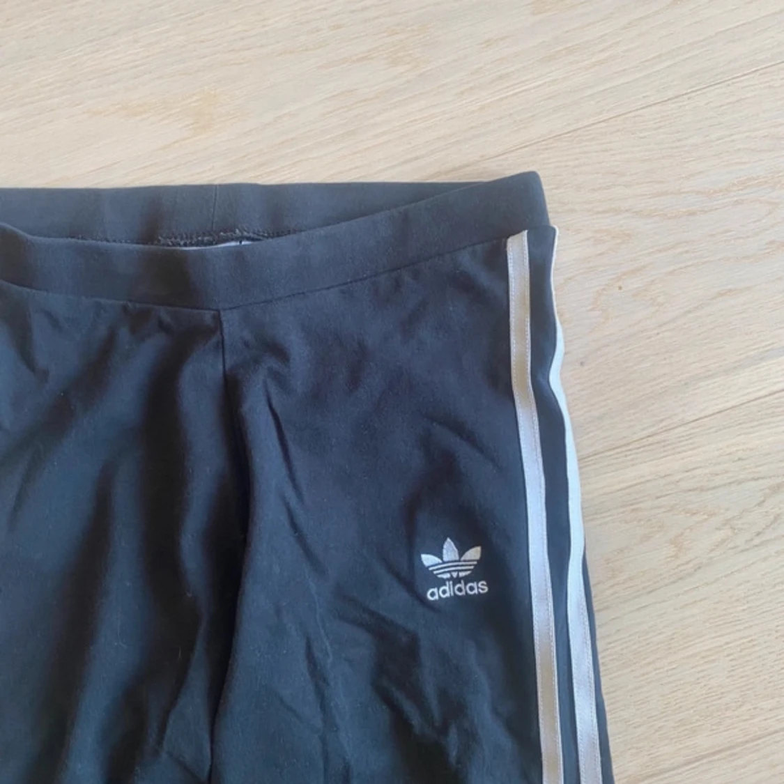 Svarta leggings från Adidas med klassiska vita ränder längs sidorna och Adidas-logga på höften. Tight passform och stretchigt material som sitter snyggt. Perfekta för en sportig och avslappnad look.
