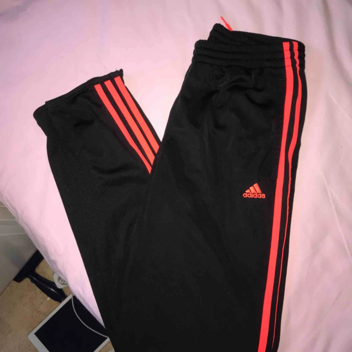 Ett par svarta Adidasbyxor med oranga sträck, knappt använda 🥰