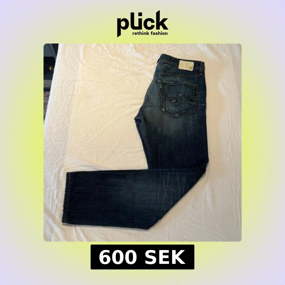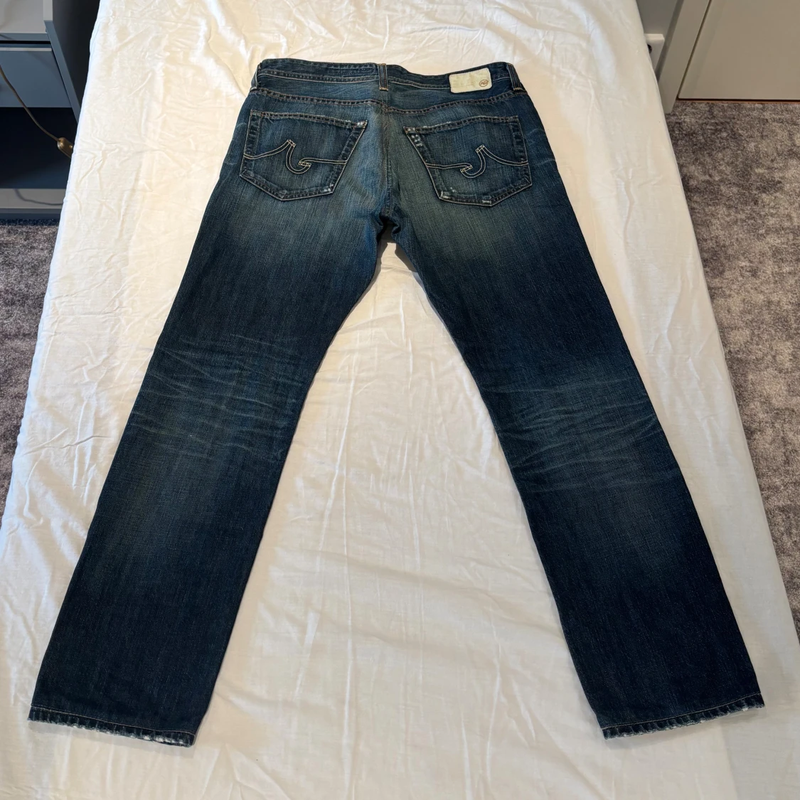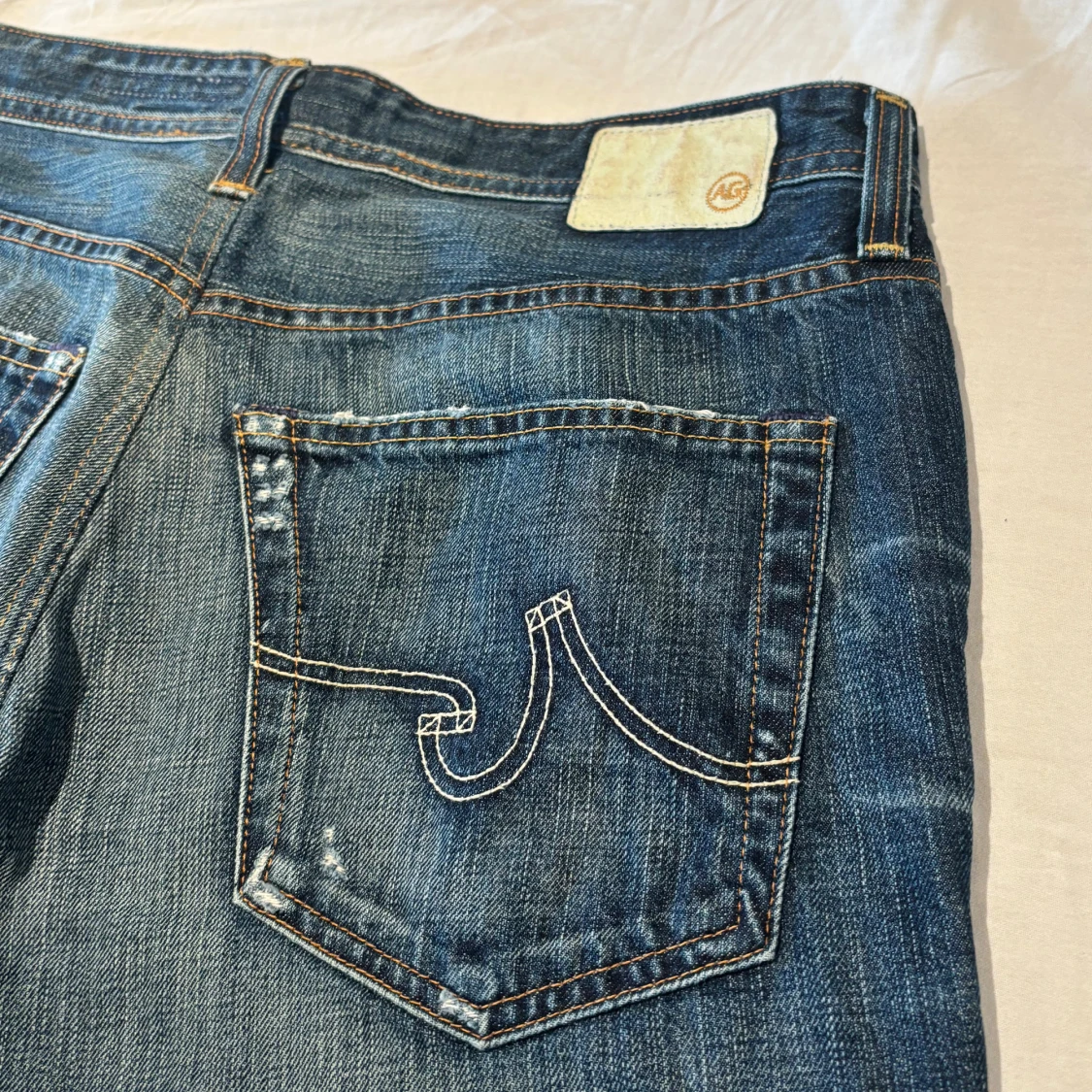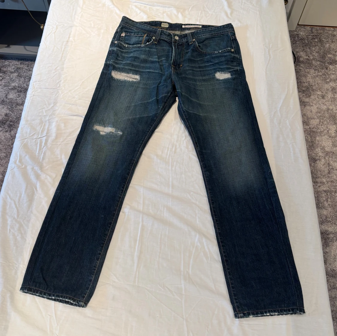 Snygga mörkblå jeans från AG (Adriano Goldschmied) med designade slitningar framtill. Jeansen har raka ben och normal/slim passform. Adriano Goldschied är ett lyxmärke som säljer jeans för mellan 2500-5000kr. Skicket på jeansen är fantastisk, inga tecken på användning. Storlek 34/34.