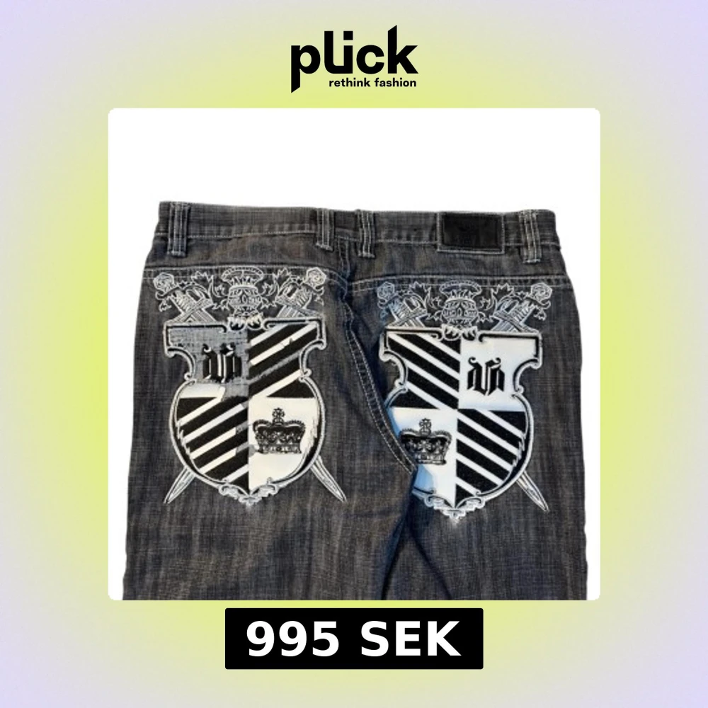 Säljer ett par gråa jeansbyxor från Victorious med stora broderade sköldar och kronor i svart och vitt på bakfickorna. Byxorna har vida ben och klassisk femficksdesign. Perfekta för dig som vill sticka ut med detaljerad brodyr. Grå/svarta