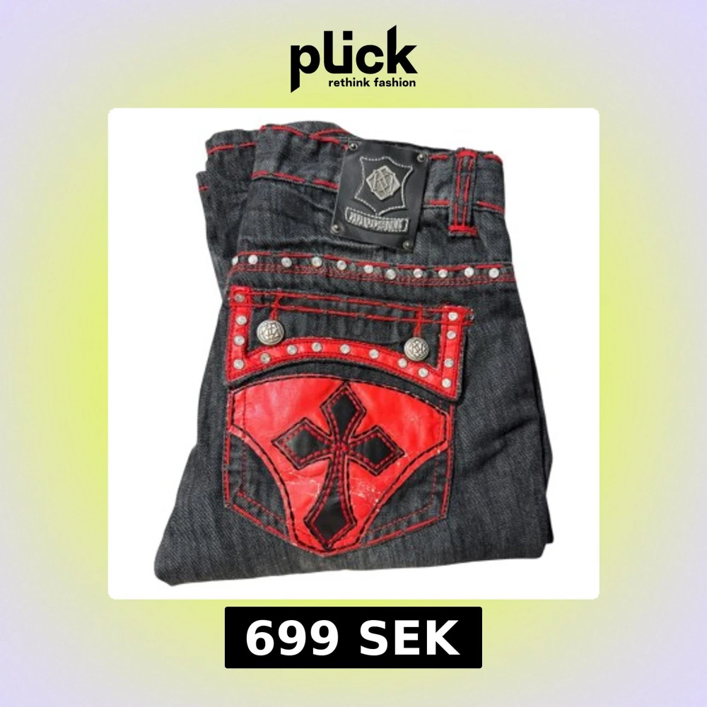Unika svarta jeans med röda kontrastsömmar, stora bakfickor med röda och svarta korsapplikationer samt nitar. Märkespatch i läder baktill och dekorativa knappar. Snyggt slitna detaljer framtill och bak. Lite nötta på bakfickorna o coin pocket men inget man tänker på.