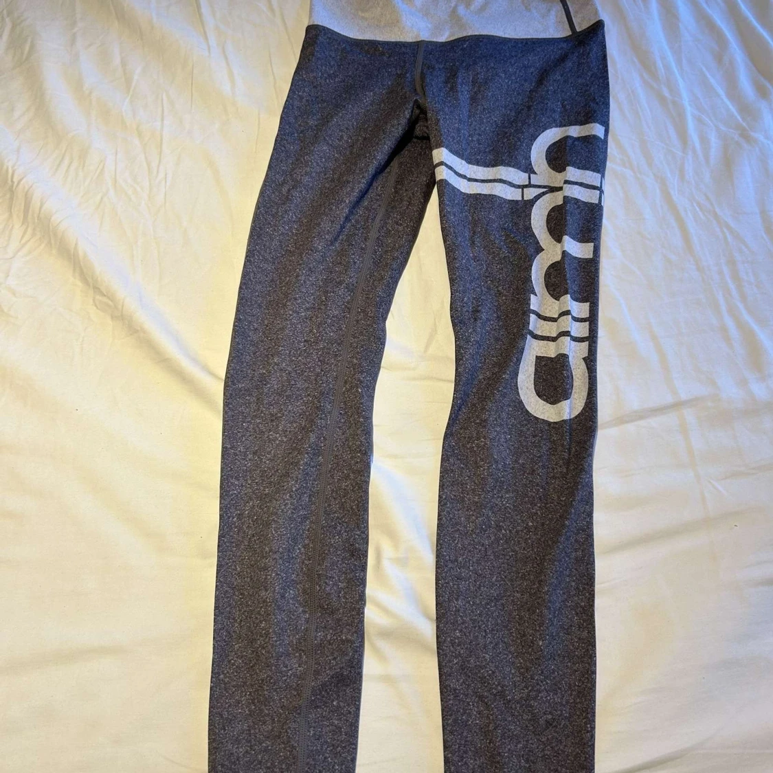 Snygga grå leggings med bred ljusgrå midja och vita ränder samt tryck på ena benet. Perfekta för träning eller chill, med stretchigt material som sitter skönt och följer kroppen. Sportig look med coola detaljer som sticker ut.