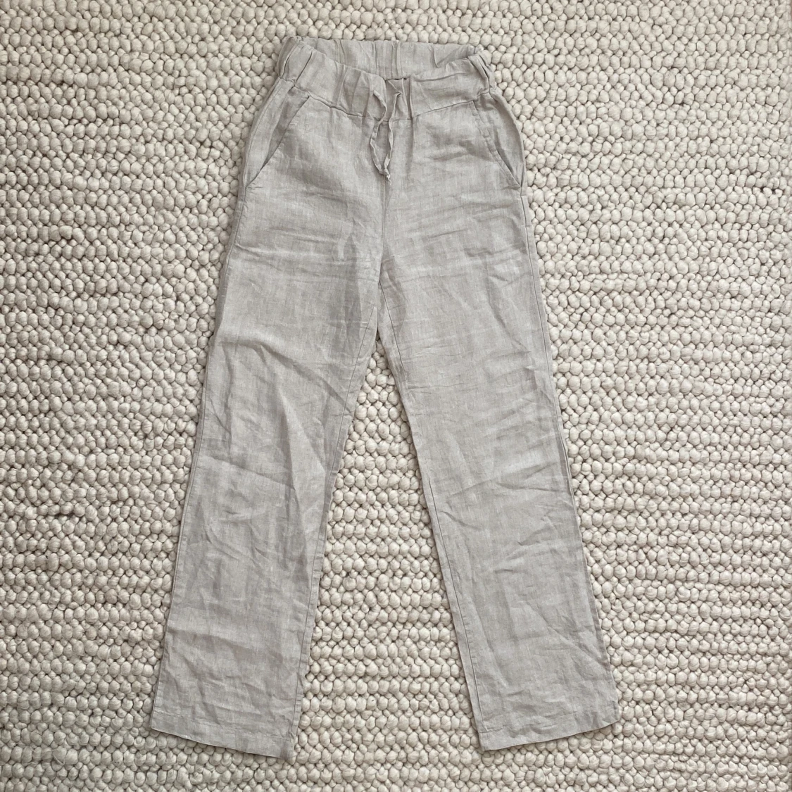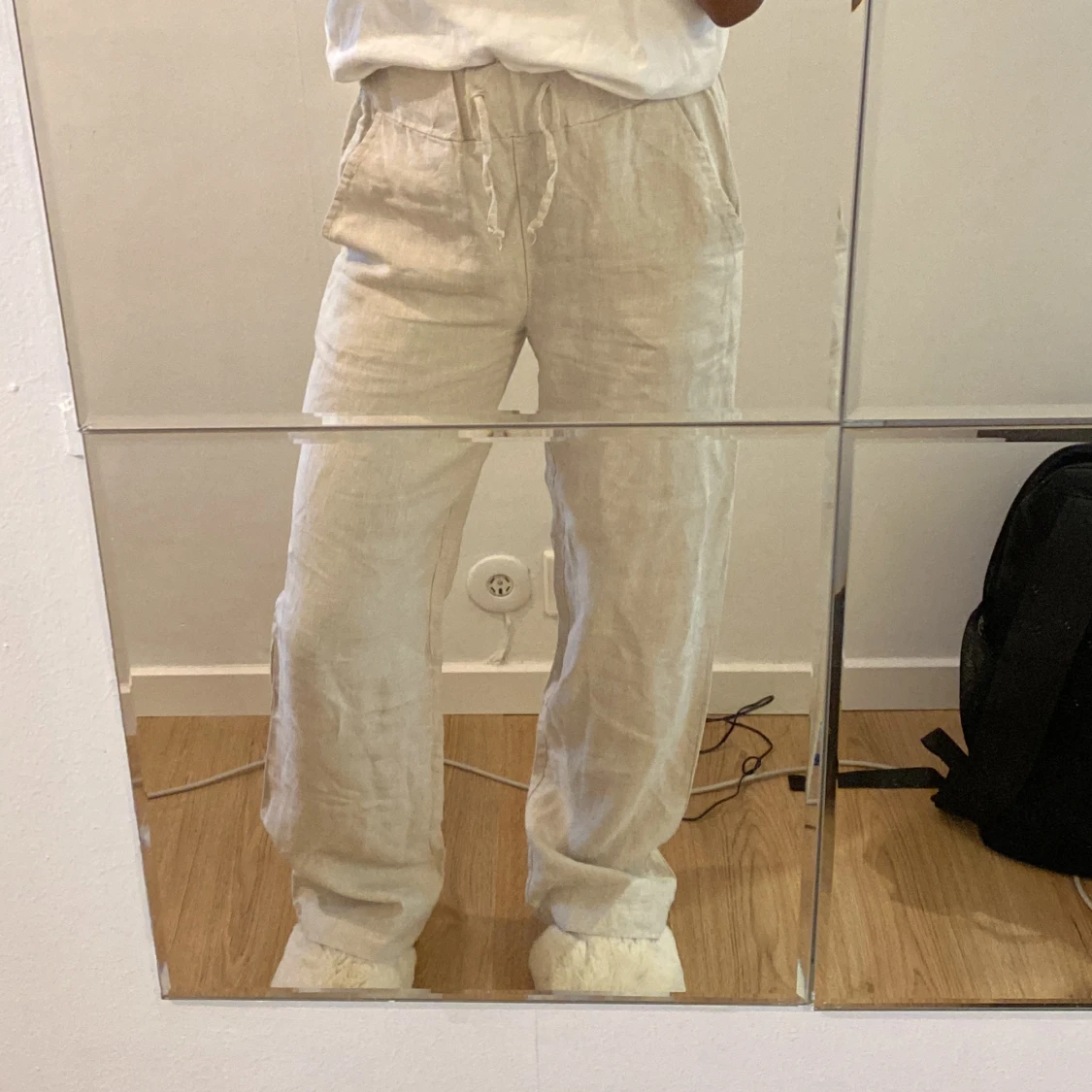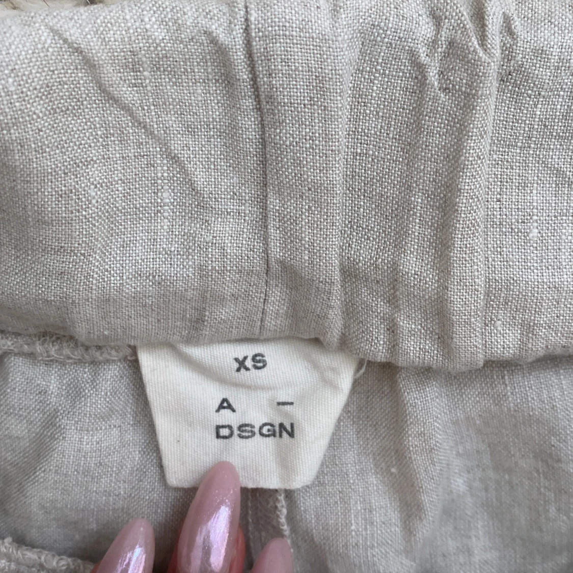 Säljer dessa beiga linnebyxor från A-dsgn. De är väldigt långa därav har de fått lite slitage nertill. Storlek XS, jag är 164cm och dom är nog 5 cm för långs för mig.