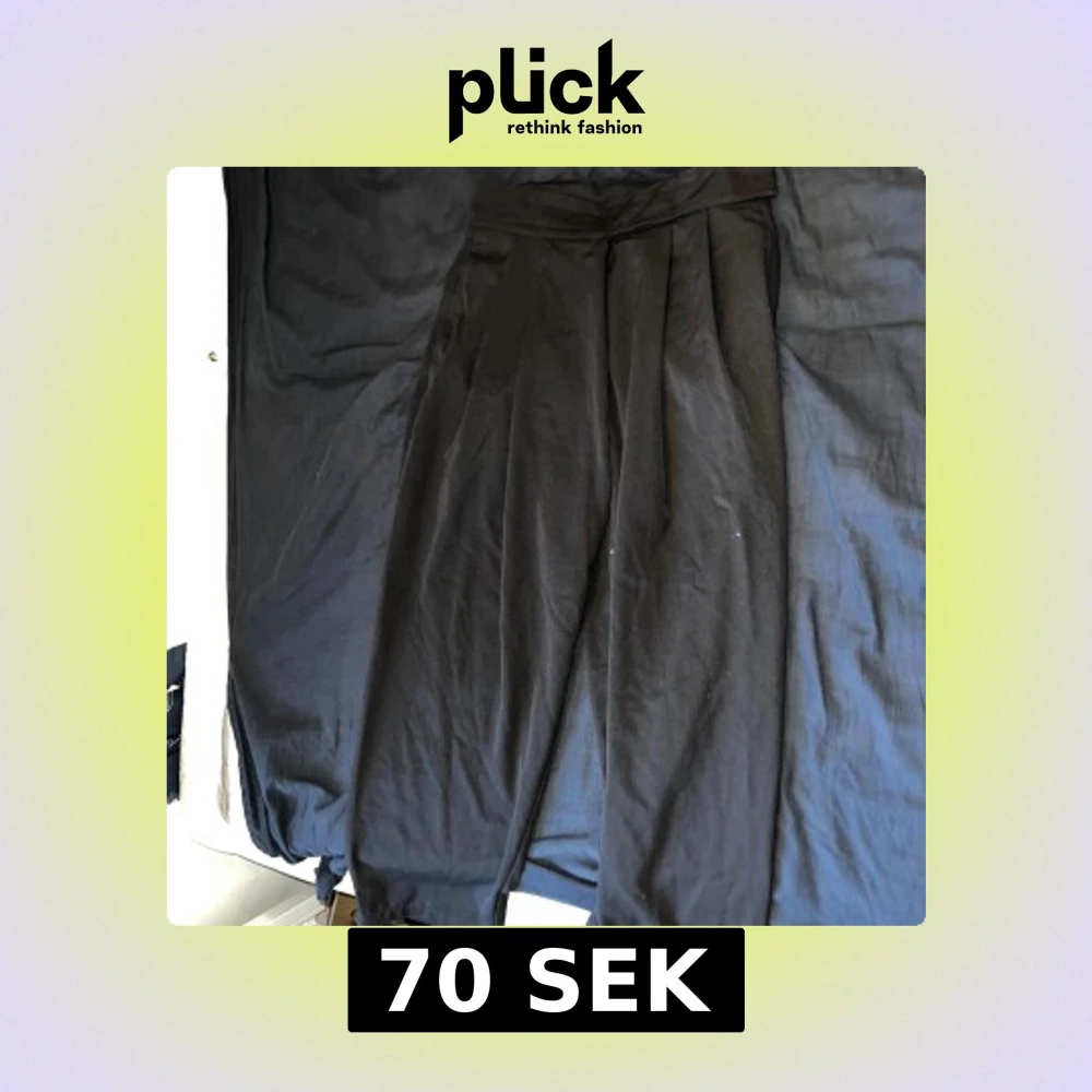 Säljer ett par svarta kostymbyxor med hög midja och vida ben. Byxorna har pressveck framtill och två bakfickor. Snyggt skräddad look och passar perfekt till en stilren outfit.