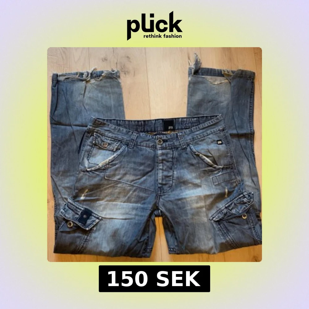 Säljer ett par blå cargopants från Jack & Jones med flera fickor, knappar och coola detaljer. Byxorna har bred passform och är tillverkade i jeansmaterial. Slitna vid änden på benen men inget man tänker på. Jag är ~170cm och dem passar bra. Skriv om ni har frågor💕