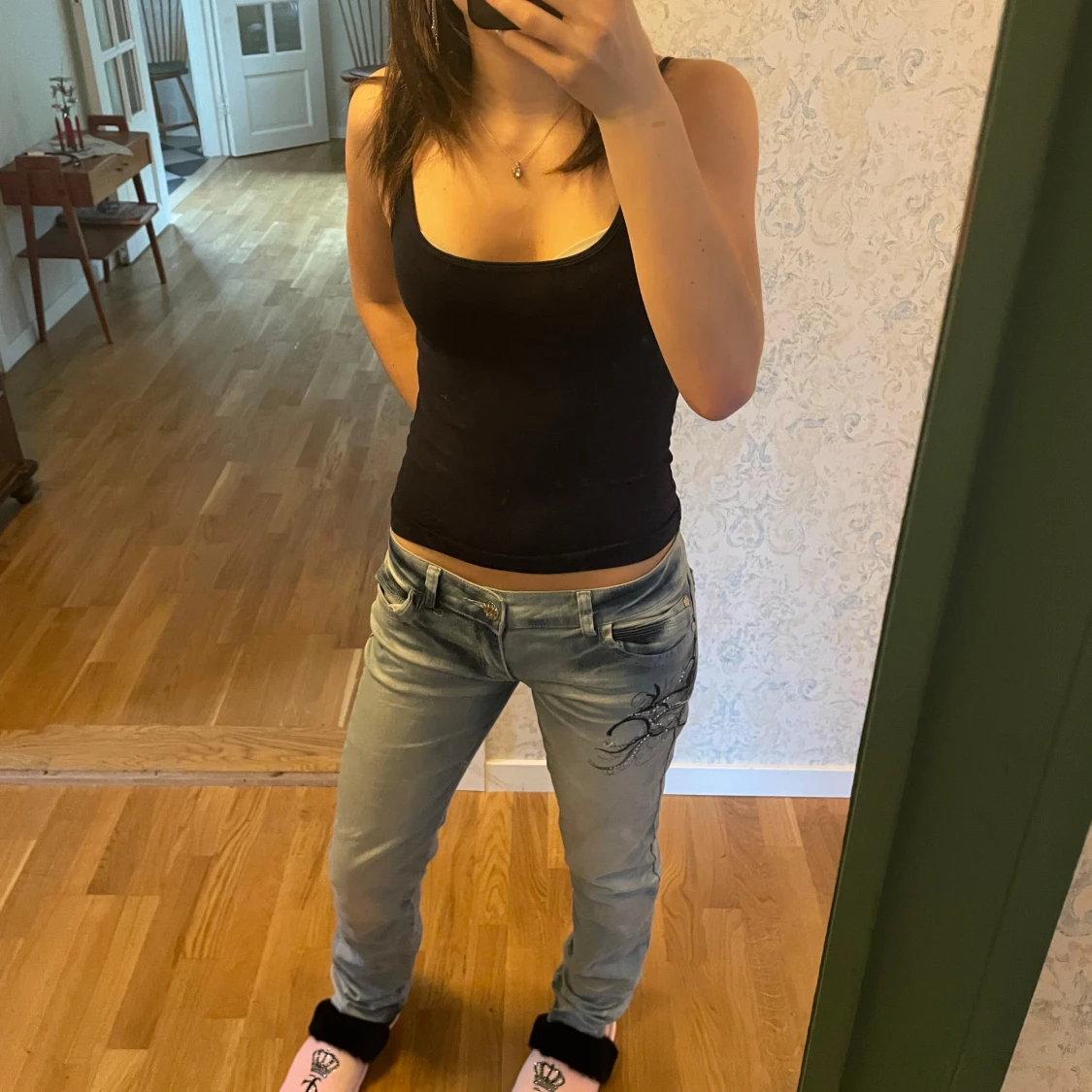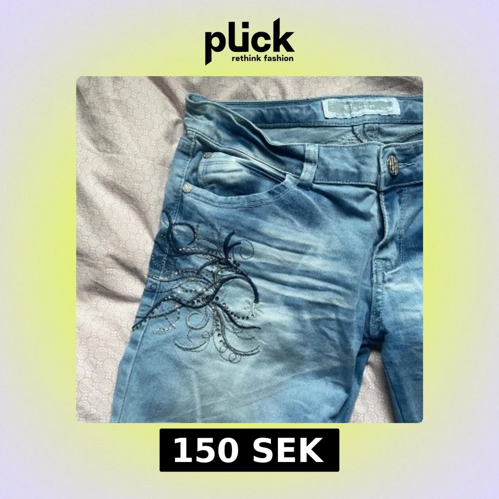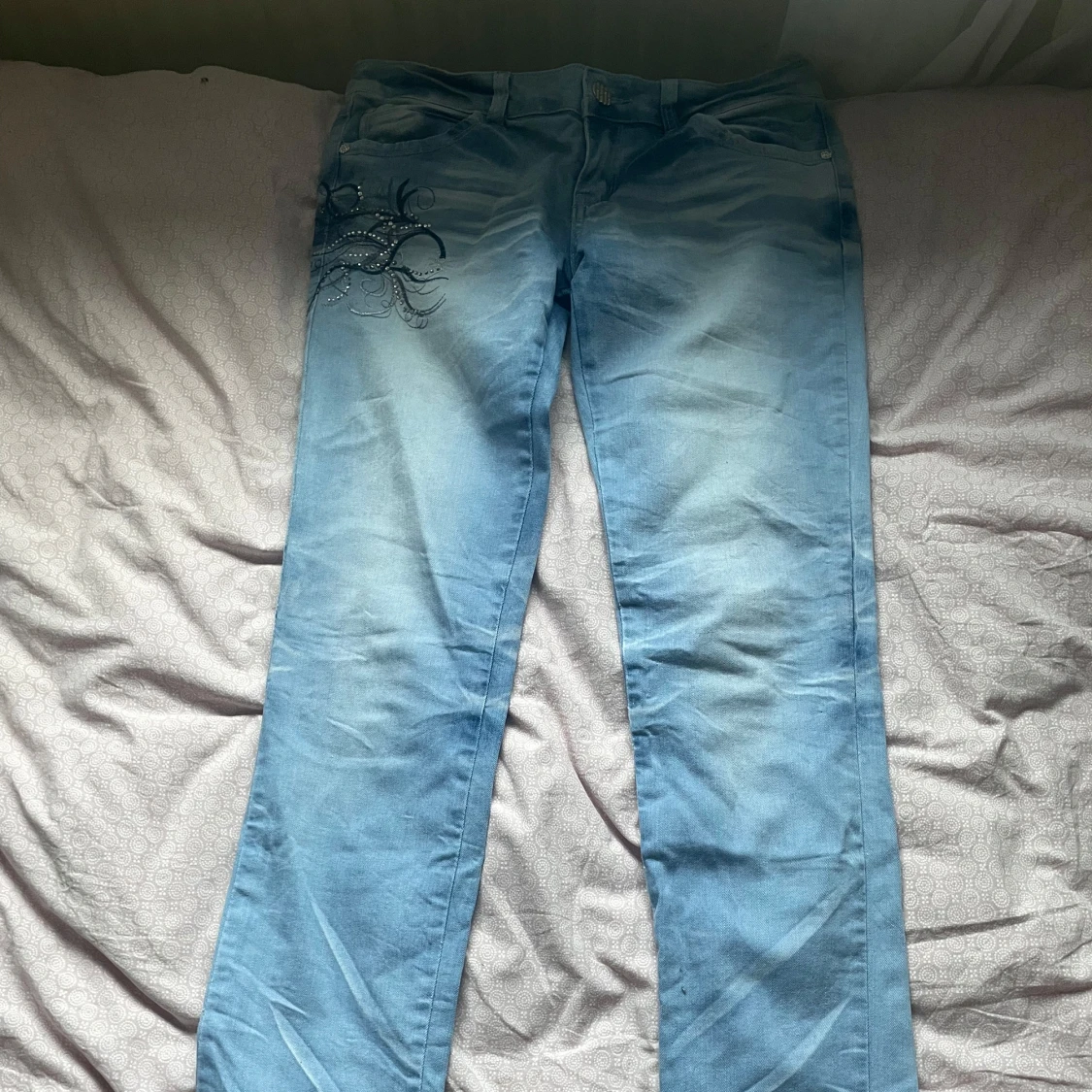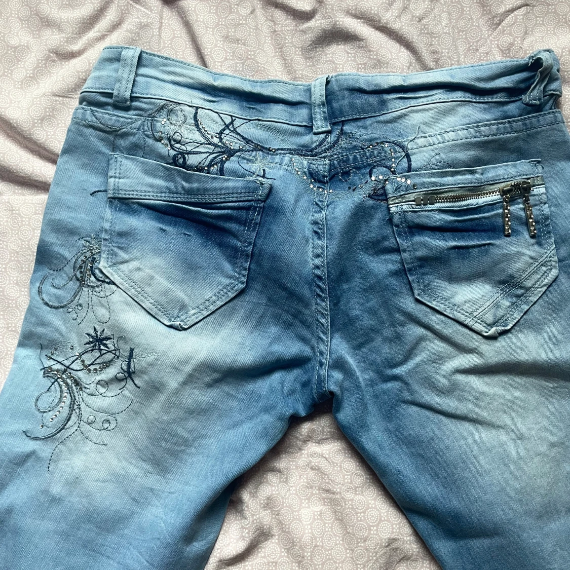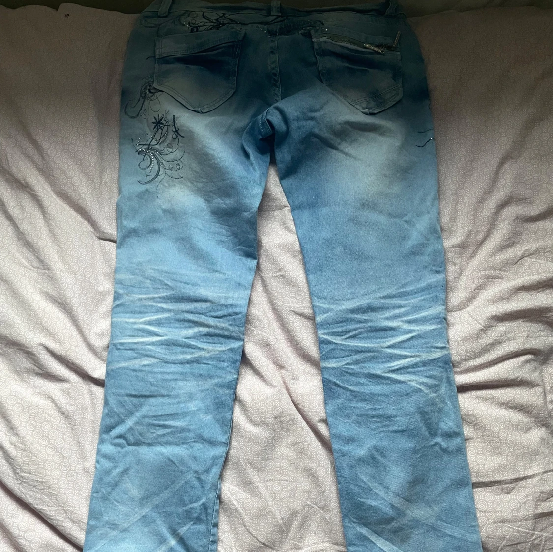 Snygga lågmidjade ljusblå jeans från Eleven med unikt broderi och strassdetaljer på fram- och baksida. Jeansen är straight leg men är också lite stretchiga. Några stenar saknas men det syns inte på håll och jeansen har tvär snygg knapp och dragkedjor.