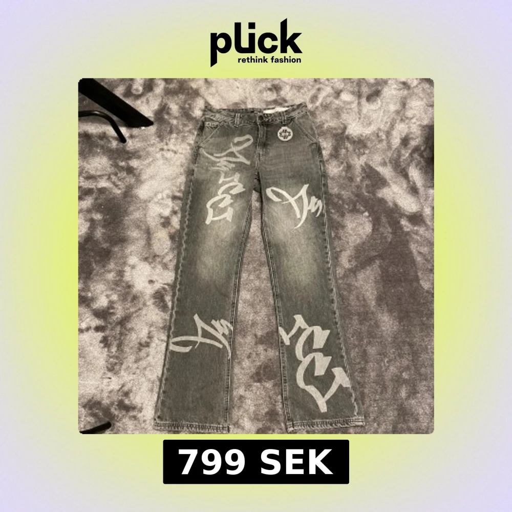 Snygga grå jeans från Amicci med coola vita grafitti-tryck på både fram- och baksida. Klassisk femficksmodell med raka ben och normal passform. Jeansen har en unik Amicci-tag i midjan och är tillverkade i slitstark denim.