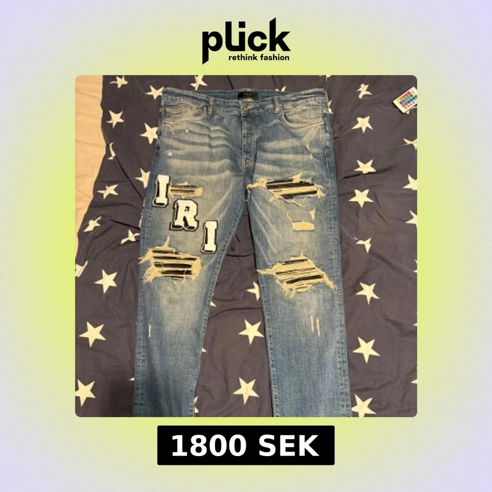 Säljer ett par blå jeans från Amiri med grymma slitningar och stora bokstavspatchar i svart och vitt på både fram- och baksidan. Jeansen har klassisk femficksdesign, skinny passform och coola detaljer som trasiga partier med svarta ränder under. Perfekt för dig som gillar streetstyle. Byten av andra jeans kan även funka det med