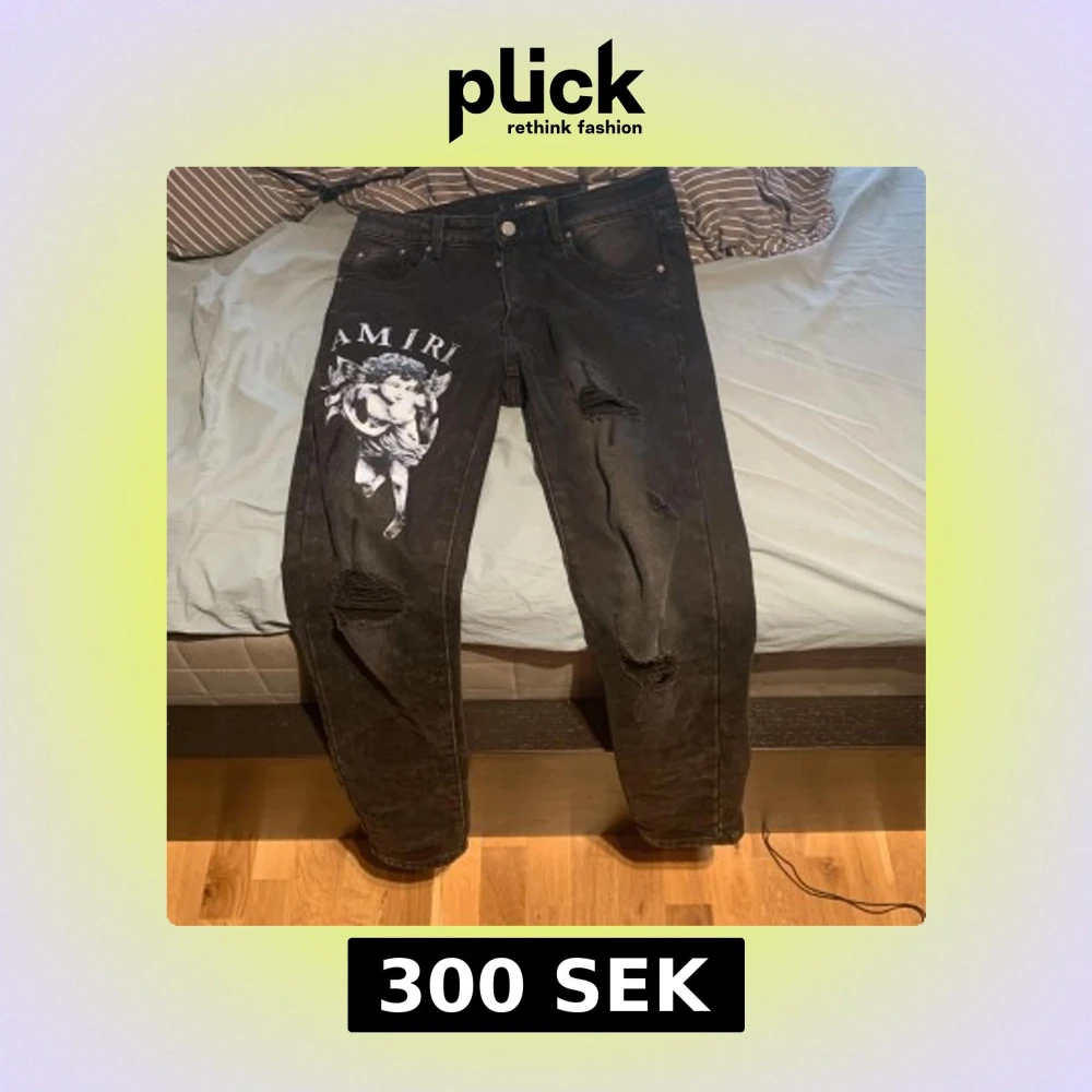 Säljer ett par svarta jeans från Amiri i storlek 32 med ett stort vitt ängeltryck och AMIRI-logga på vänster lår. Jeansen har slitna detaljer och hål på båda benen för en edgy look. Klassisk femficksmodell i jeansmaterial.