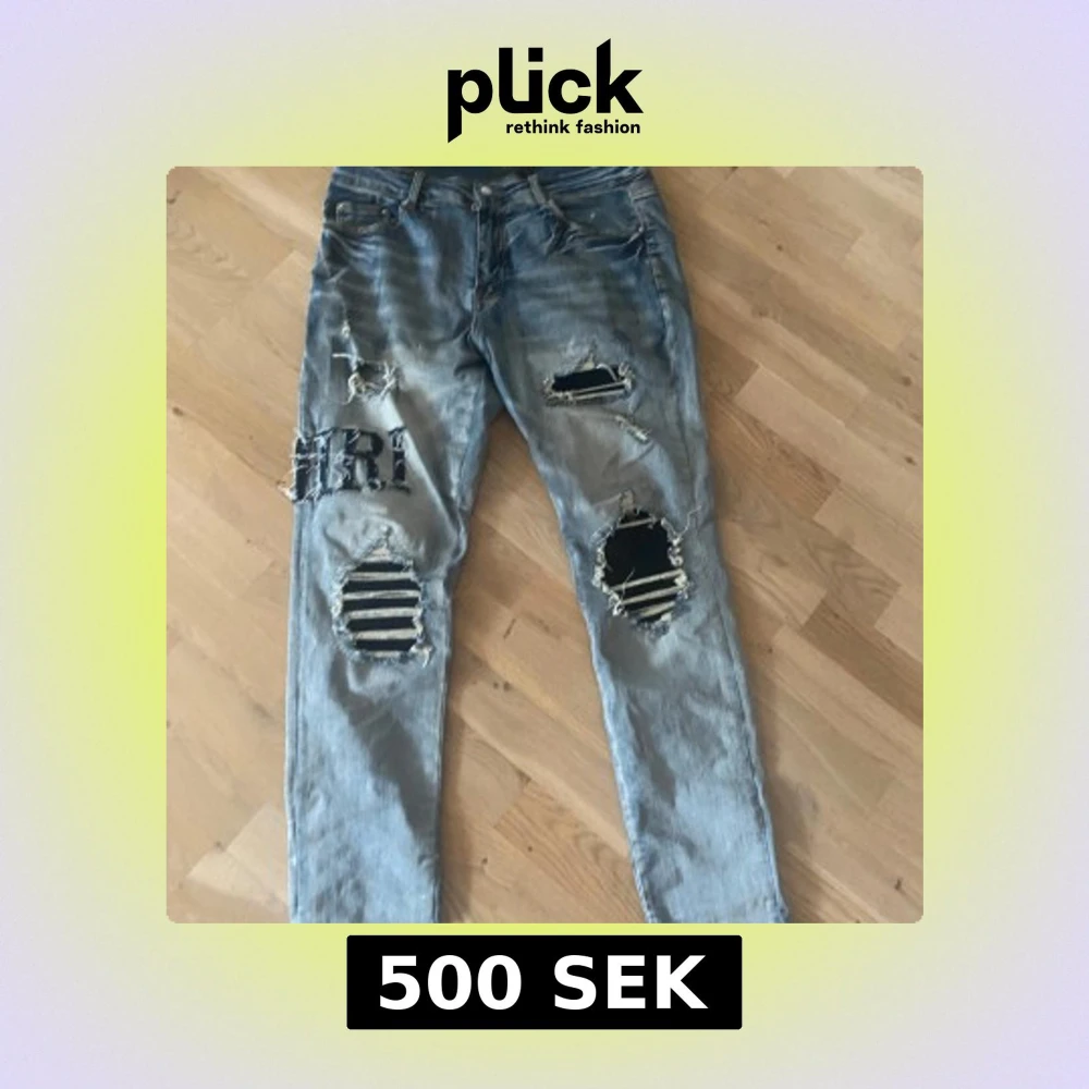 Riktigt feta ljusblå jeans från Amiri med slitna hål och svarta/vita patchar under. Snygga broderade bokstäver och råa kanter ger jeansen en unik vibe. Klassisk femficksmodell och normal passform. Perfekta för dig som gillar streetstyle och statement-plagg.