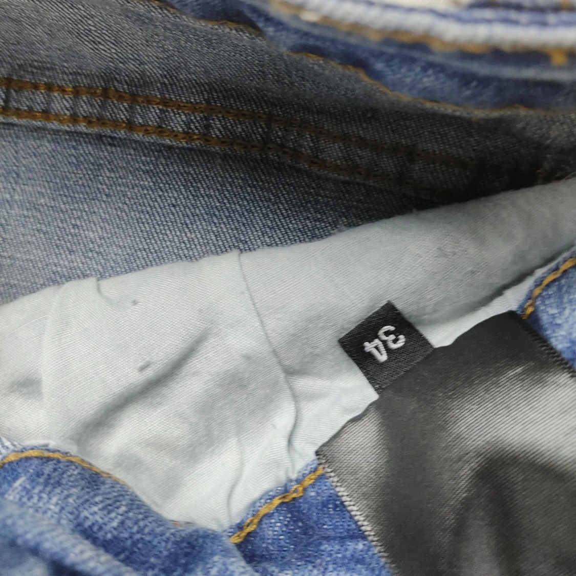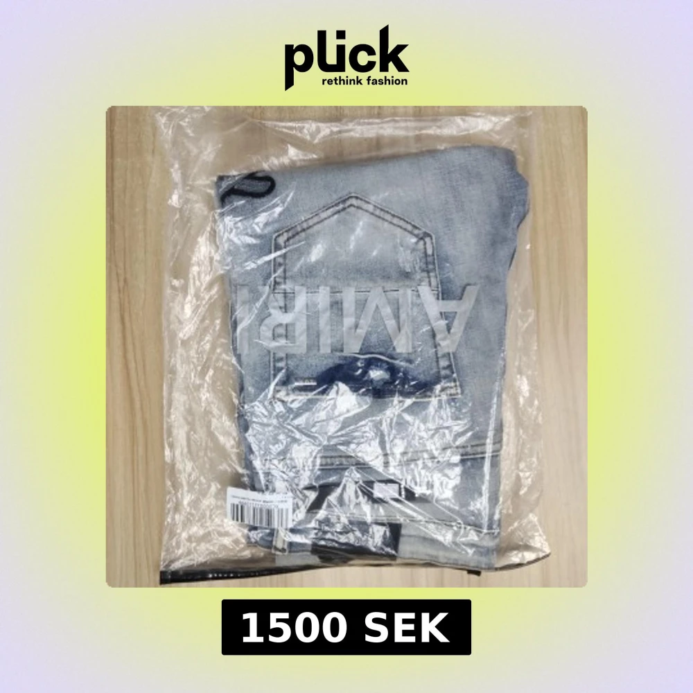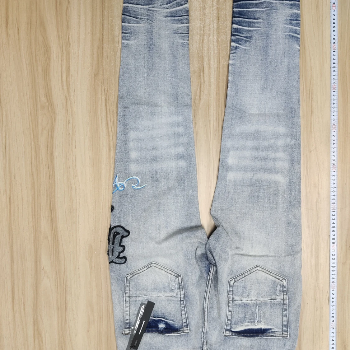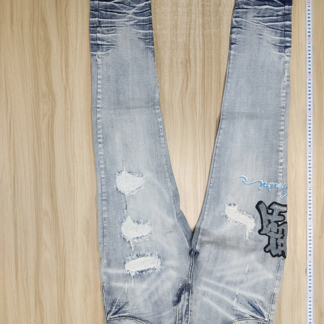 Säljer ett par ljusblå jeans från Amiri med slitna detaljer, broderier och patchar på benen. Jeansen har en skinny passform och är tillverkade i klassiskt denimtyg. Snygga kontrastsömmar och coola slitningar ger ett riktigt street-inspirerat uttryck.