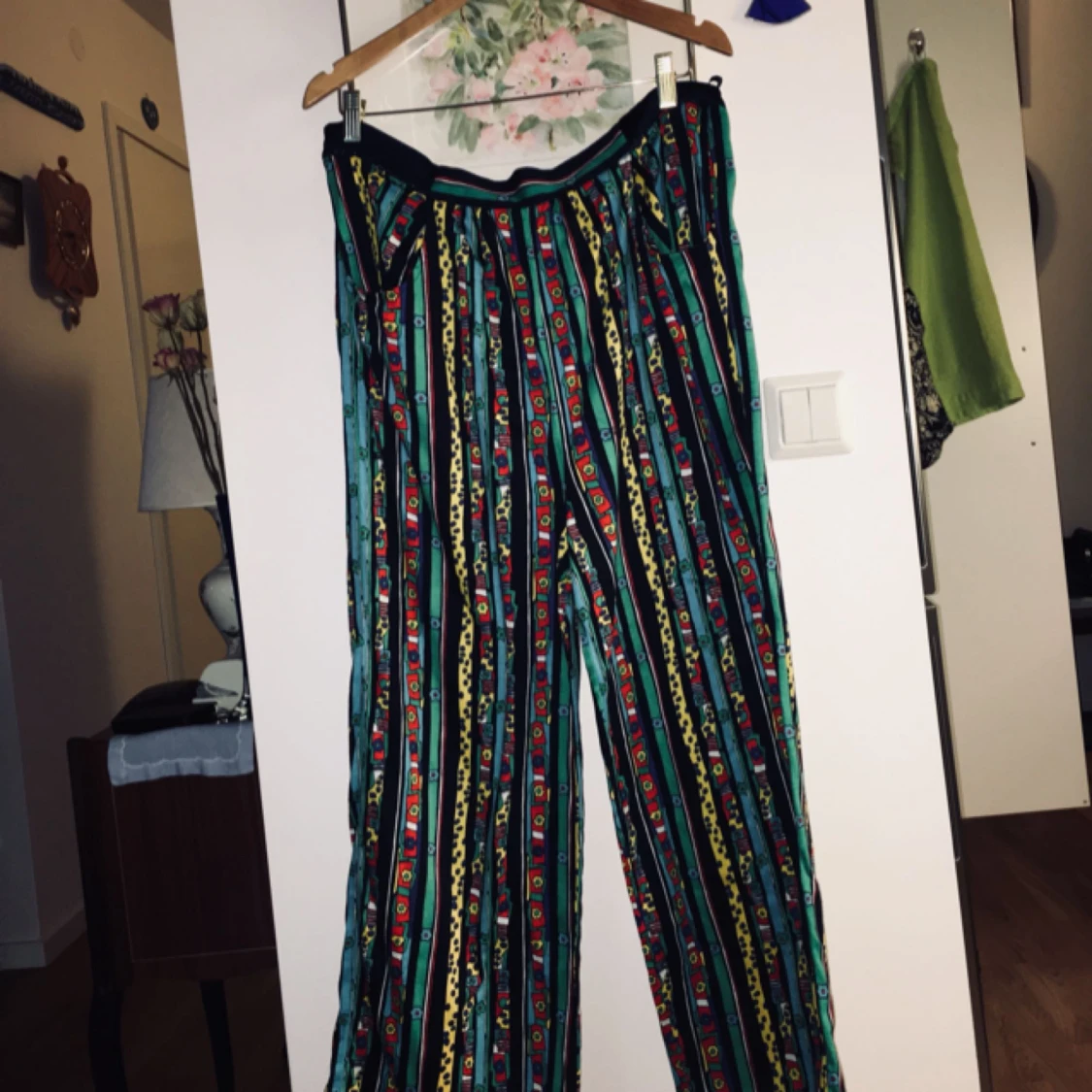 Snygga färgglada mönstrade byxor i tunt material. De har fickor och är i storlek 40. Passar till pyjamas och till vardags.