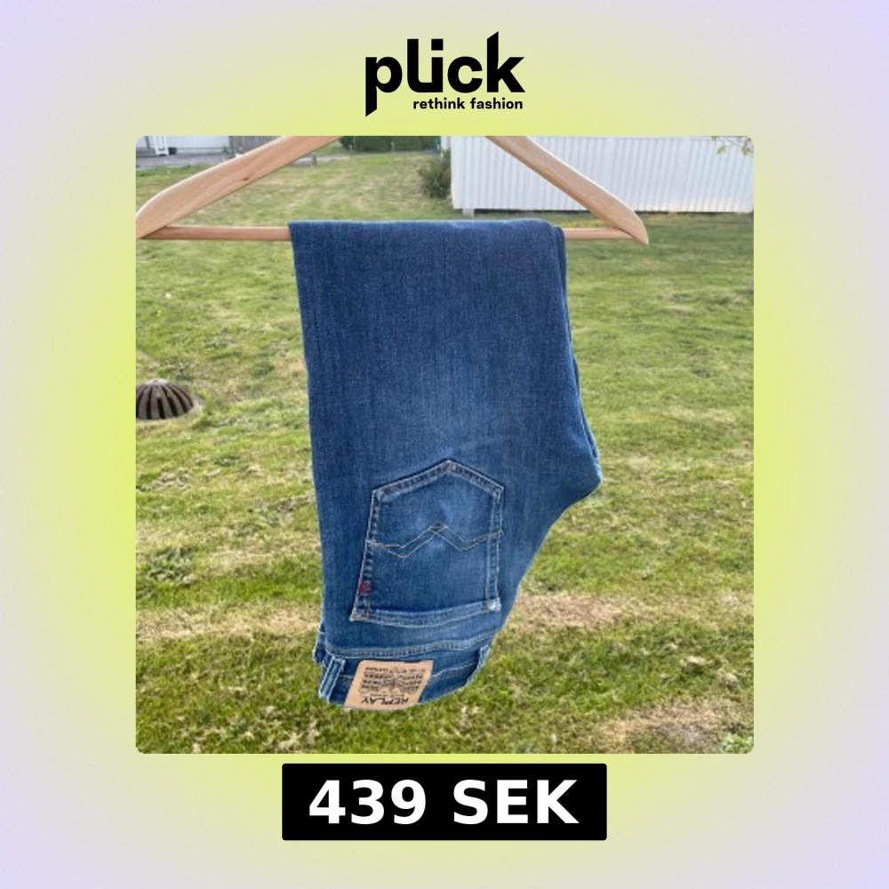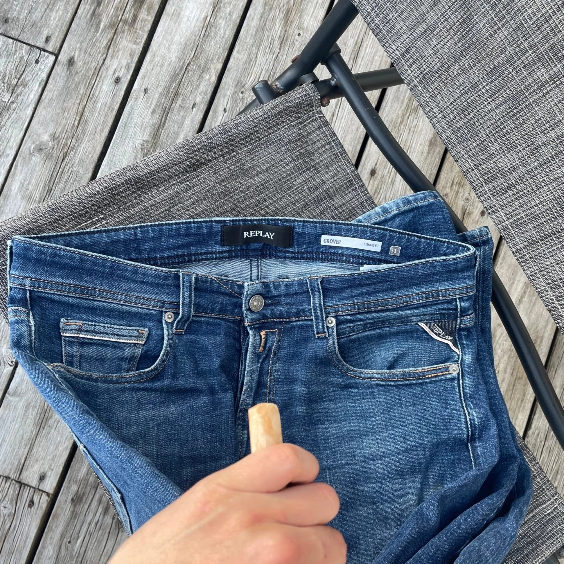 Säljer ett par klassiska blå jeans från Replay med fem fickor och snygga detaljer på bakfickan. Byxorna har normal passform och är tillverkade i ett mjukt denimty. Perfekta för dig som gillar stilrena och bekväma jeans.