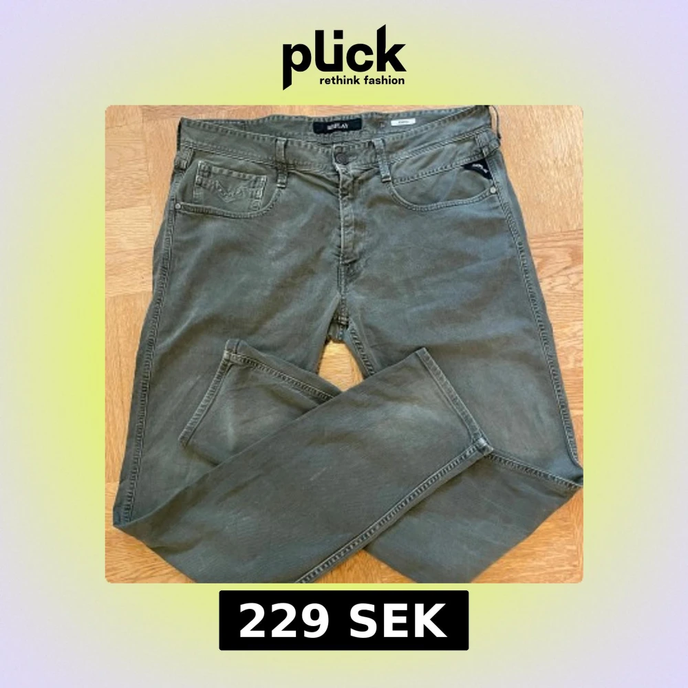 Jeans från Replay i modell anbass. Storlek W34 L32. Byxorna är lite grå grön aktiga men är snygga. Skick 7/10. Hör av er vid minsta fundering😊