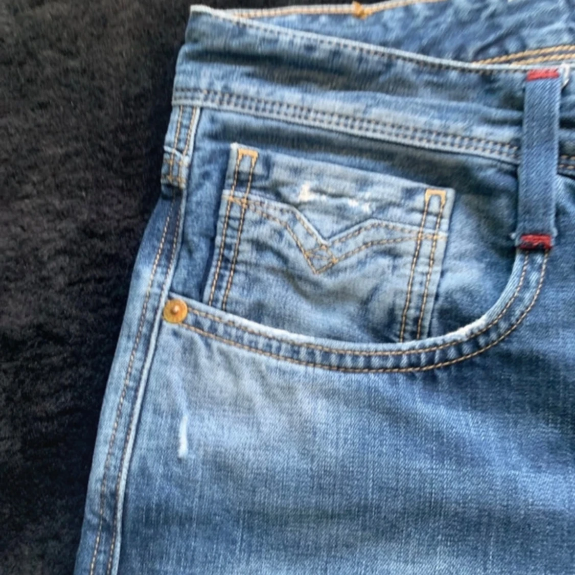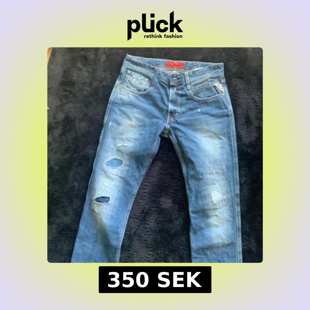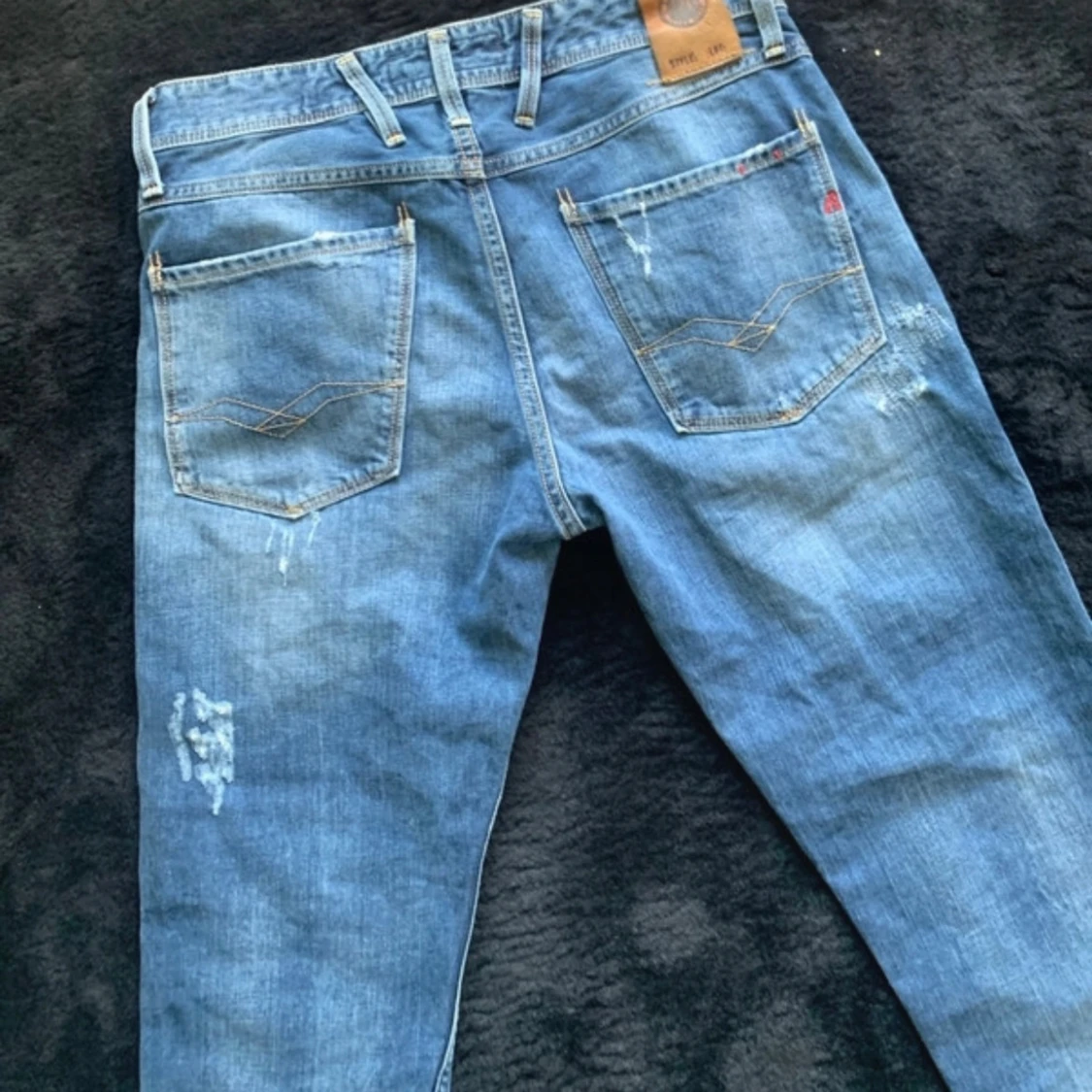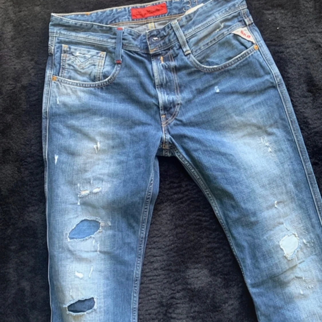 Säljer ett par blå jeansbyxor från Replay Stl 31/34 med slitningar, normal passform. Snygga detaljer och tydliga slitningar för en trendig look.