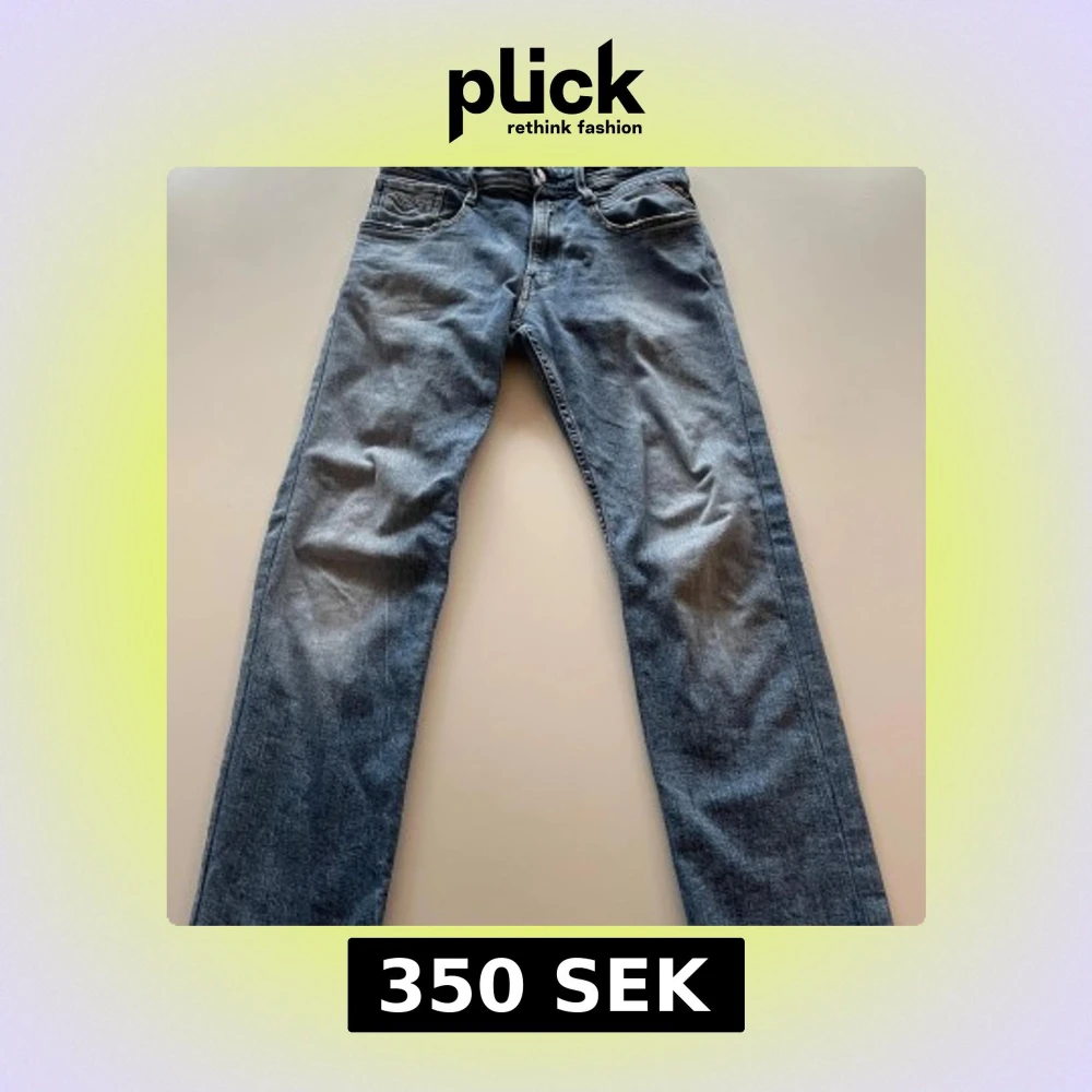 Snygga blåa jeans från Replay (anbass)med klassisk femficksdesign och broderad detalj på bakfickan. Jeansen har en slimfit passform och är tillverkade i slitstarkt denim. Perfekta för avslappnad/grisch stil. Modellen är Anbass. Passar dig runt 160-170. Pris går att diskuteras