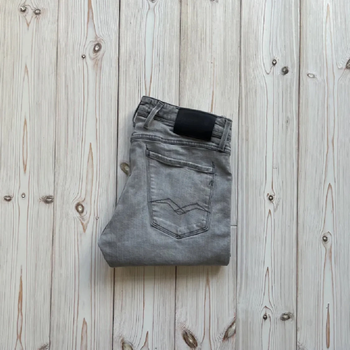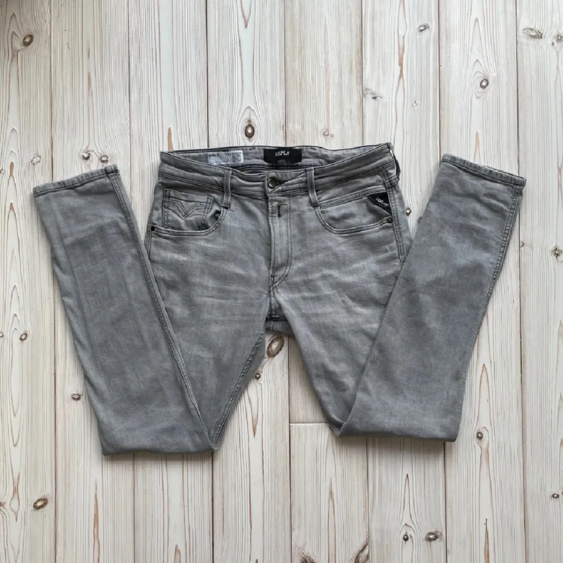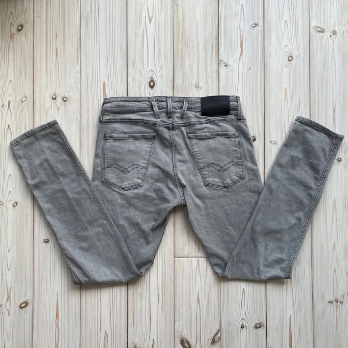 Snygga grå jeansbyxor från Replay i modellen Anbass. De har en slim fit passform och helt ny skick , priset kan diskuteras vid snabb affär. 32 i längd och brädd