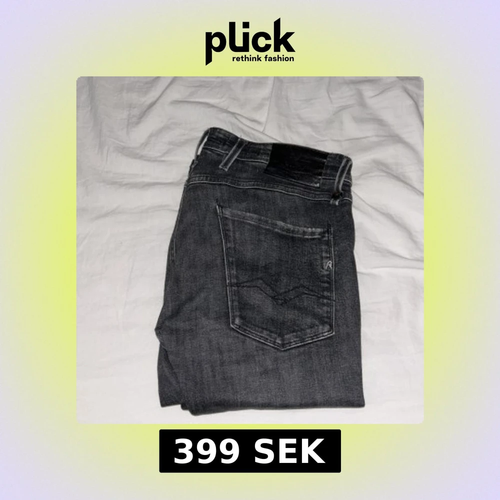 Säljer ett par Replay Anbass Slim fit jeans, mörk grå! Feta slitningar, dock defekt i skrevet som blivit lagad (Se bild 4!)