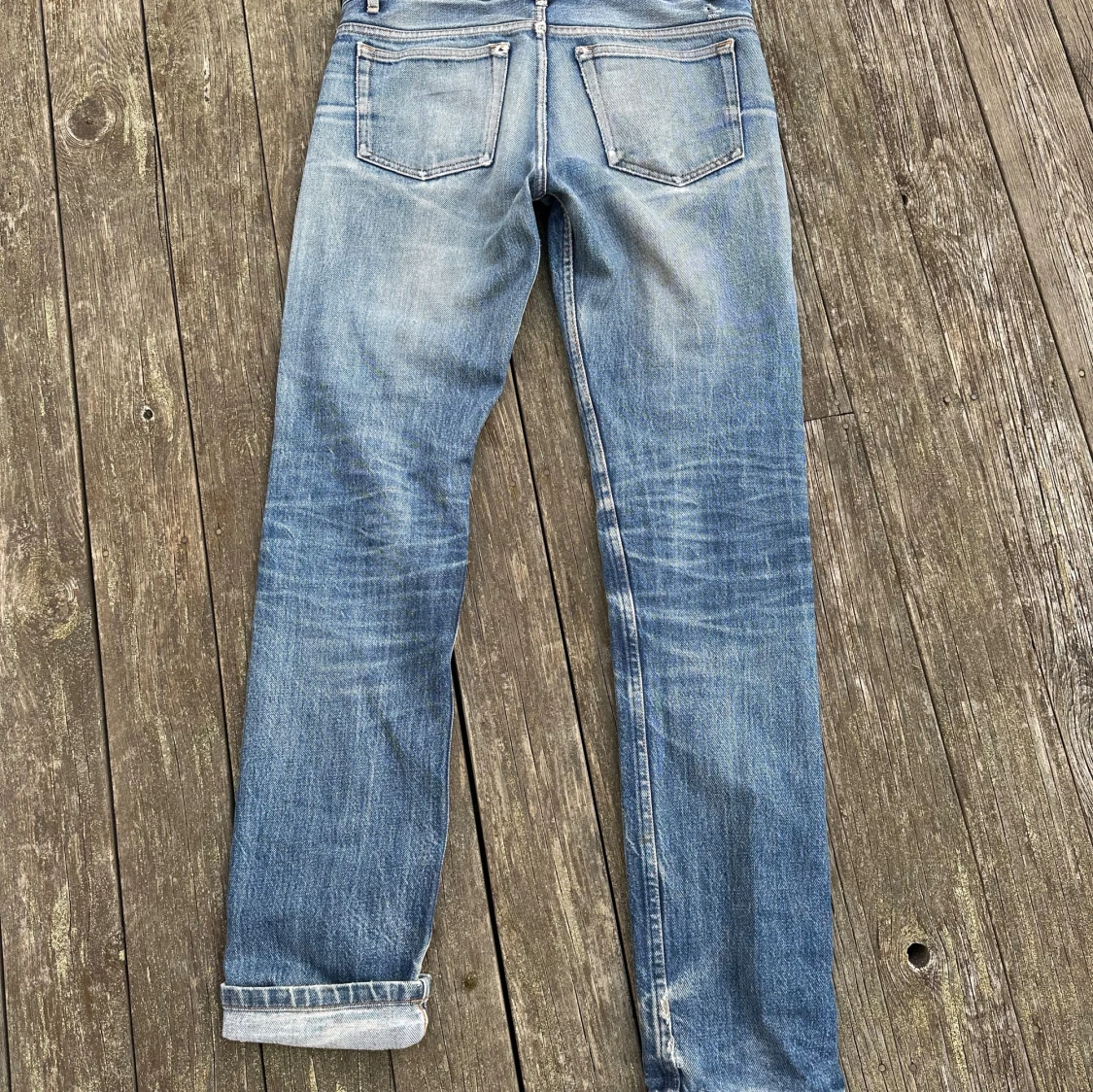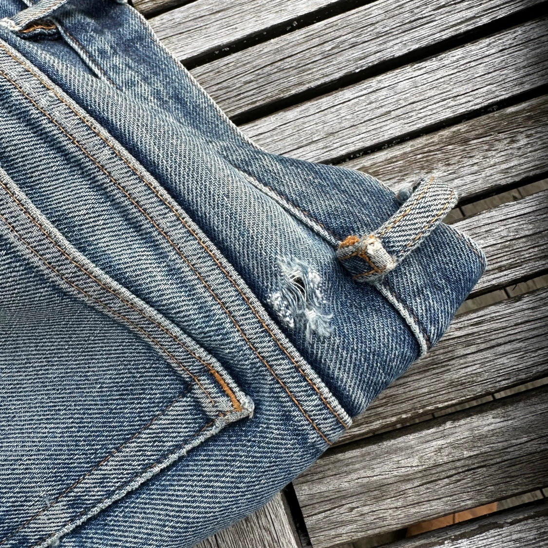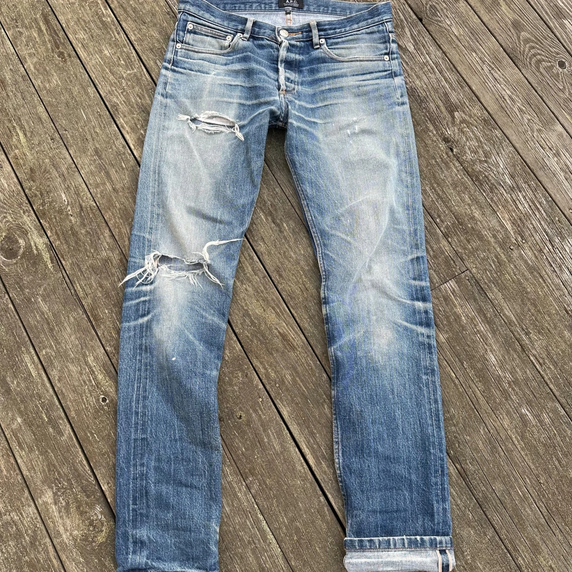 Riktigt schyssta jeans. Väl använda. Framfickorna trasiga. Mått: Ytterben 103cm, midja 40cm, benöppning 18cm