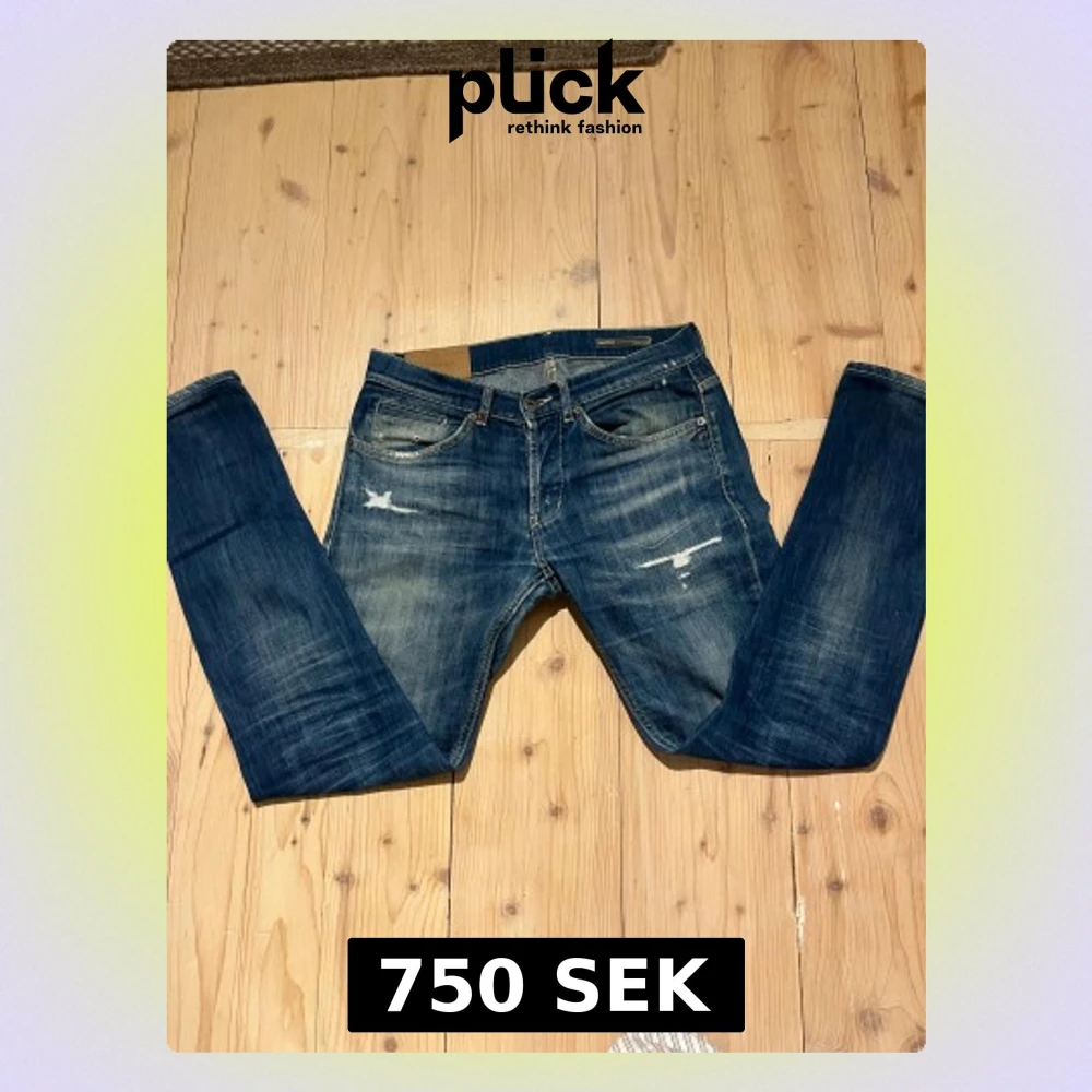 Snygga blå jeans från Dondup, modell George. Jeansen har skinny fit, slitna detaljer och klassisk femficksdesign. De är tillverkade i jeansmaterial med gul kontrastsöm och har en läderpatch bak i midjan.
