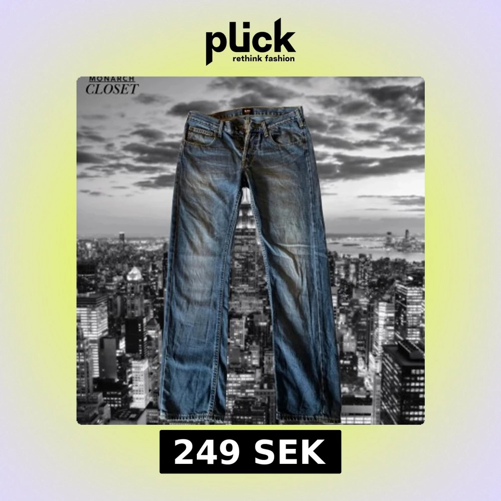 Säljer ett par klassiska blå jeans från Lee med raka ben och snygga slitningar. Jeansen har fem fickor, gylf med knappar och tydliga kontrastsömmar. Perfekta för dig som gillar en tidlös och avslappnad look.