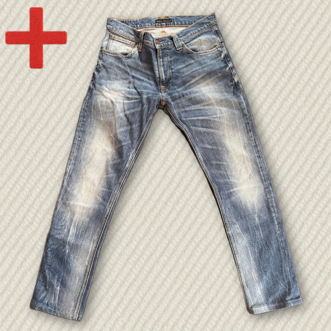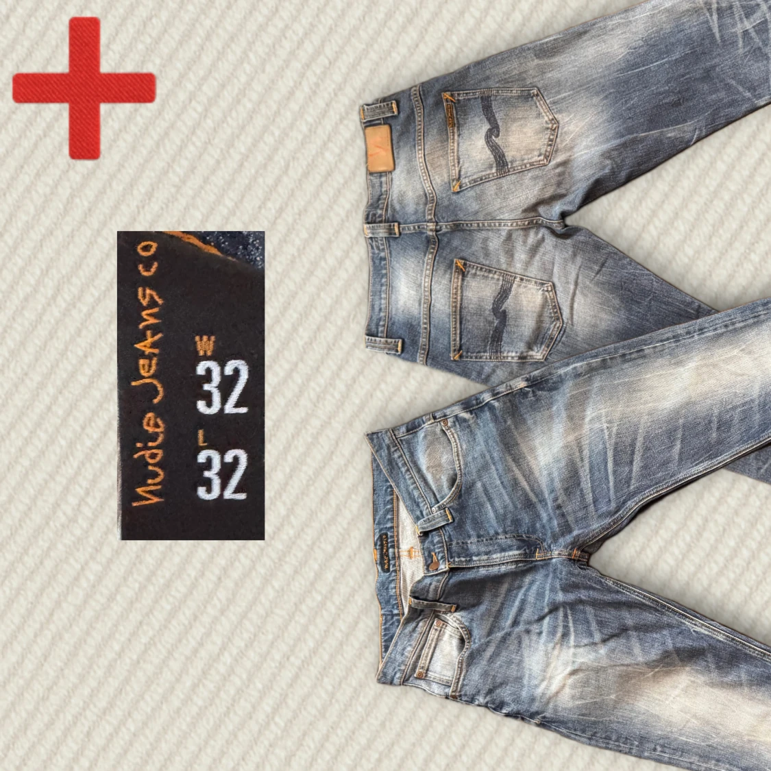Riktigt snygga Nudie Jeans med unik tvätt och i mycket bra skick! Storlek 32/32, men de verkar vara något kortade. Osäker på modell, men de sitter som slim fit. Mått: Midja – 42 cm, Innersöm – 75 cm, Yttersöm – 101 cm, Lår – 26 cm, Benöppning – 17 cm. Skriv gärna vid frågor!