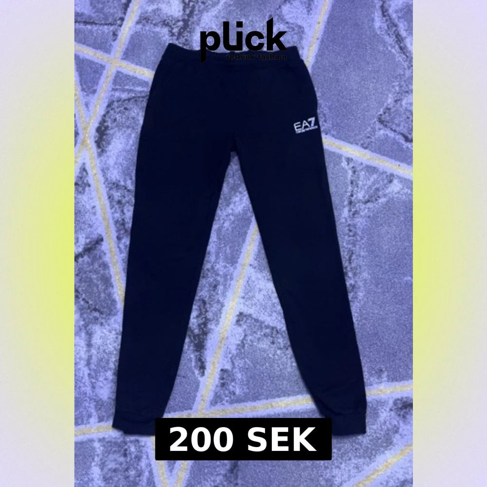 Svarta mjukisbyxor från EA7 Emporio Armani med logga tryckt på vänster lår. Byxorna har elastisk midja med snörning och ribbade muddar vid bensluten. Perfekt för chill eller träning, stilren och enkel design.