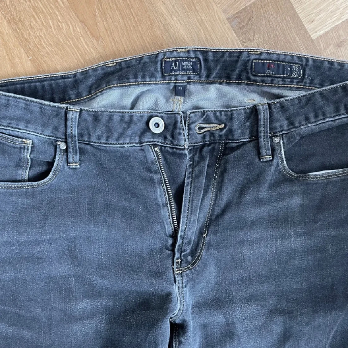Säljer mina mörkgråa/svarta Armani Jeans 7/10 men äkta. W33 men kan passa som mindre