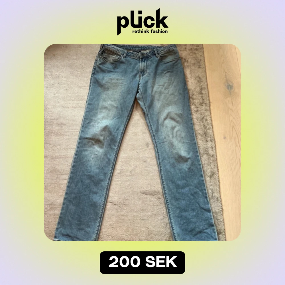 Säljer ett par snygga blå jeans från Armani i storlek W32 L32. De har en klassisk straight fit och är i bra skick. Perfekta för både vardag och fest! Jeansmaterialet är slitstarkt och har en cool tvättad look. Passar perfekt till en casual outfit eller med en snygg skjorta.