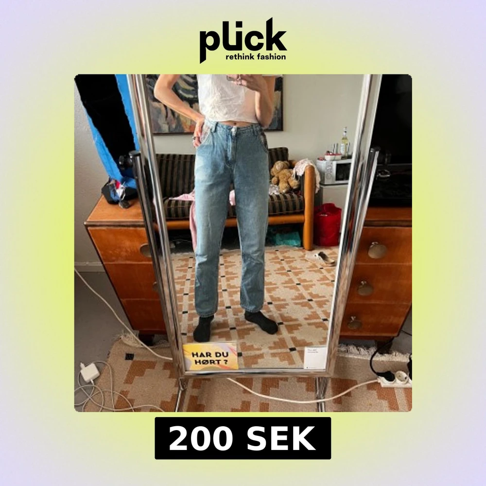 Säljer ett par ljusblå jeans med raka ben och höga i midjan. Baksidan har stora, coola stjärnor sydda på fickorna som ger en unik vibe. Jeansen är i klassisk denim och har en avslappnad passform. Perfekta för dig som vill sticka ut lite extra.