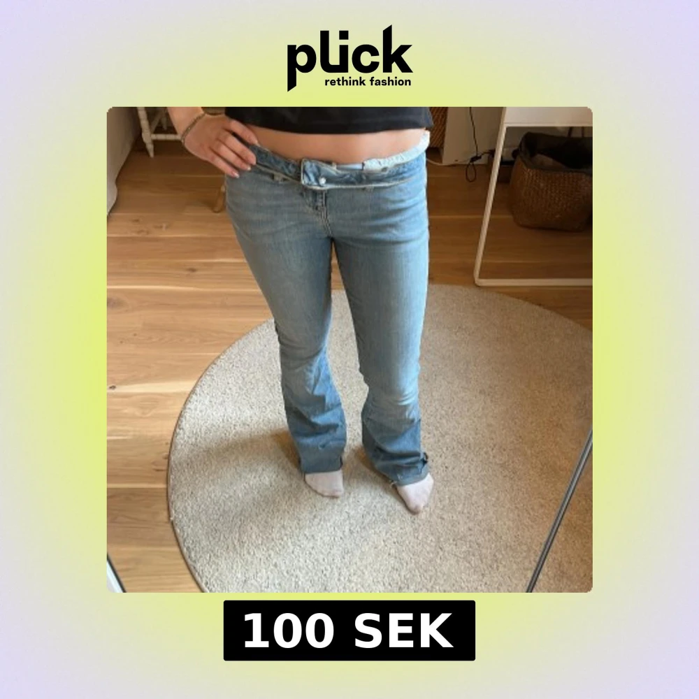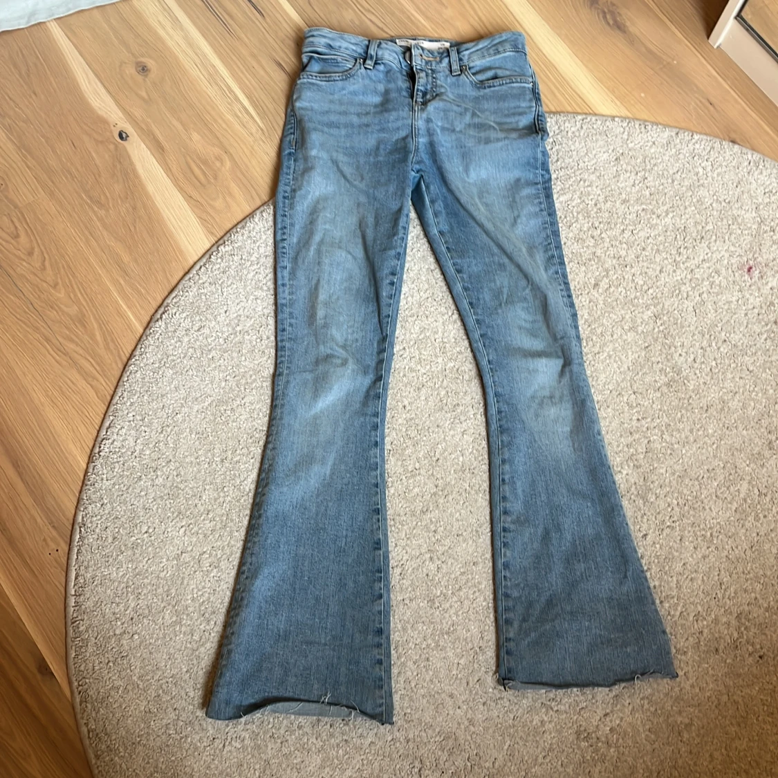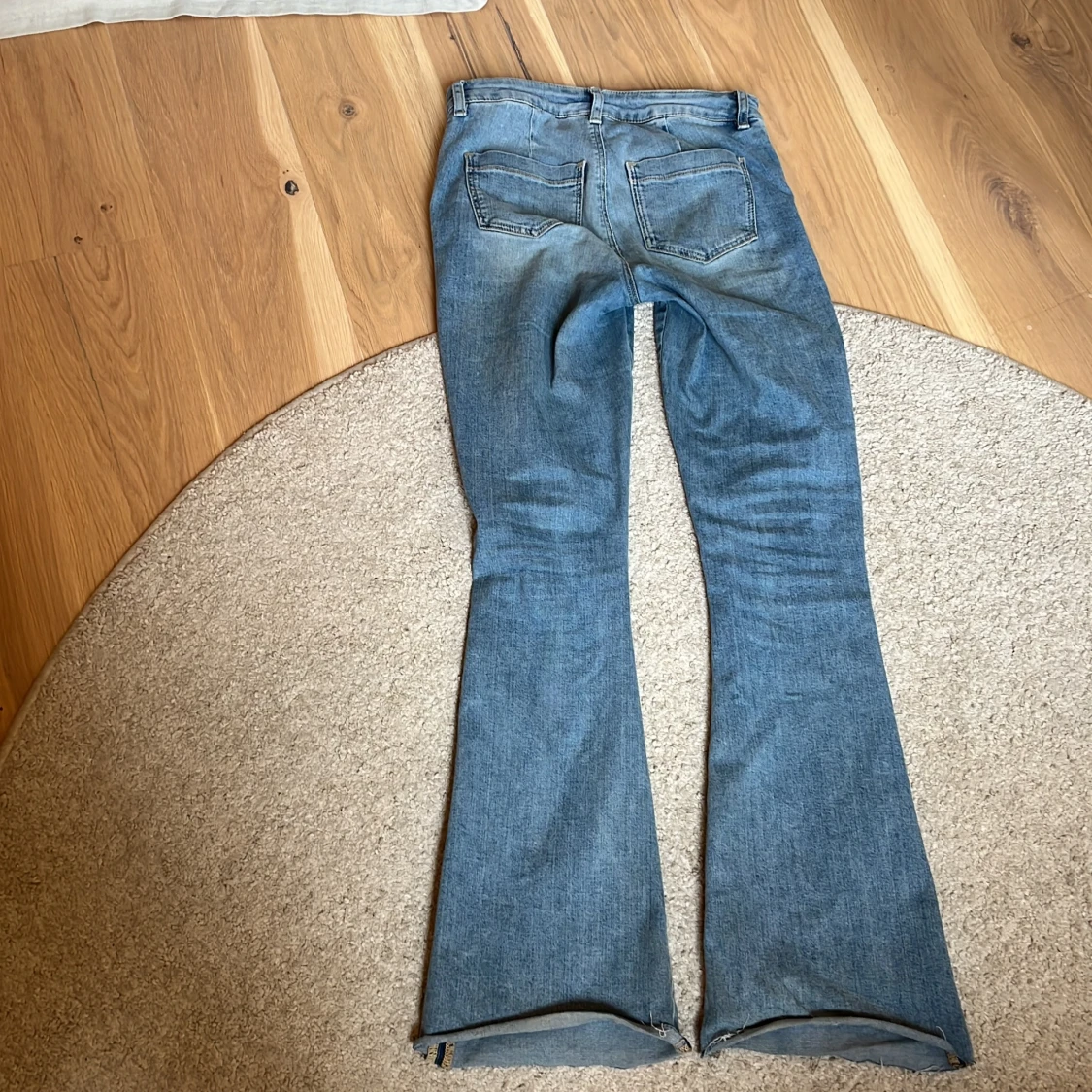 Säljer ett par ljusblå jeans med bootcut passform och låg midja. Jeansen har klassisk femficksdesign, dragkedja och knapp framtill. Perfekta för dig som gillar en retro vibe och vill ha ett par jeans med lite utsvängda ben.
