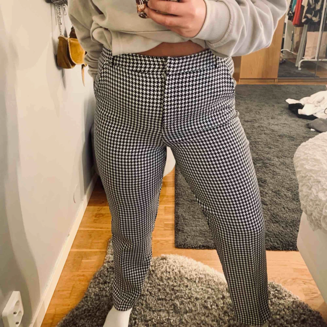 Rutiga kostymbyxor i storlek 40, men skulle säga att de passar 36-38