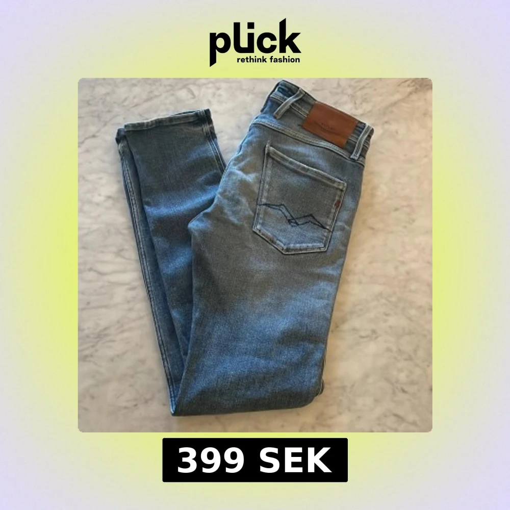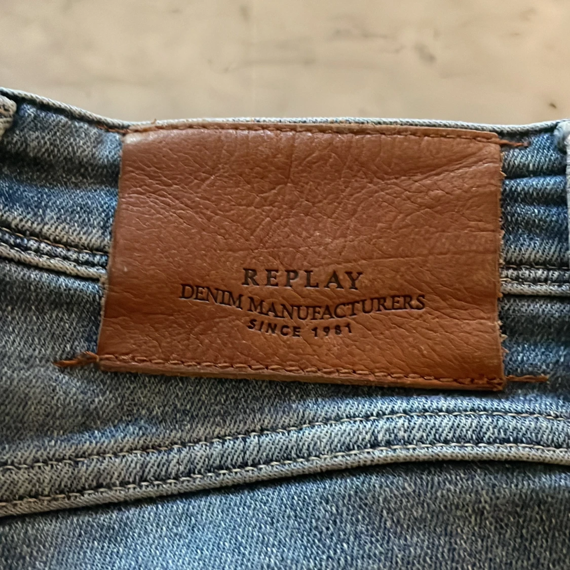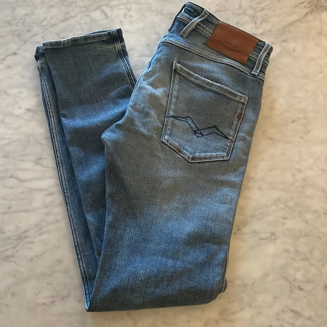 Säljer ett par snygga ljusblå jeans från Replay med klassisk femficksdesign och läderpatch bak. Jeansen har raka ben, normal passform och är tillverkade i mjukt denimtyg. Perfekta för dig som gillar stilrena och bekväma jeans.