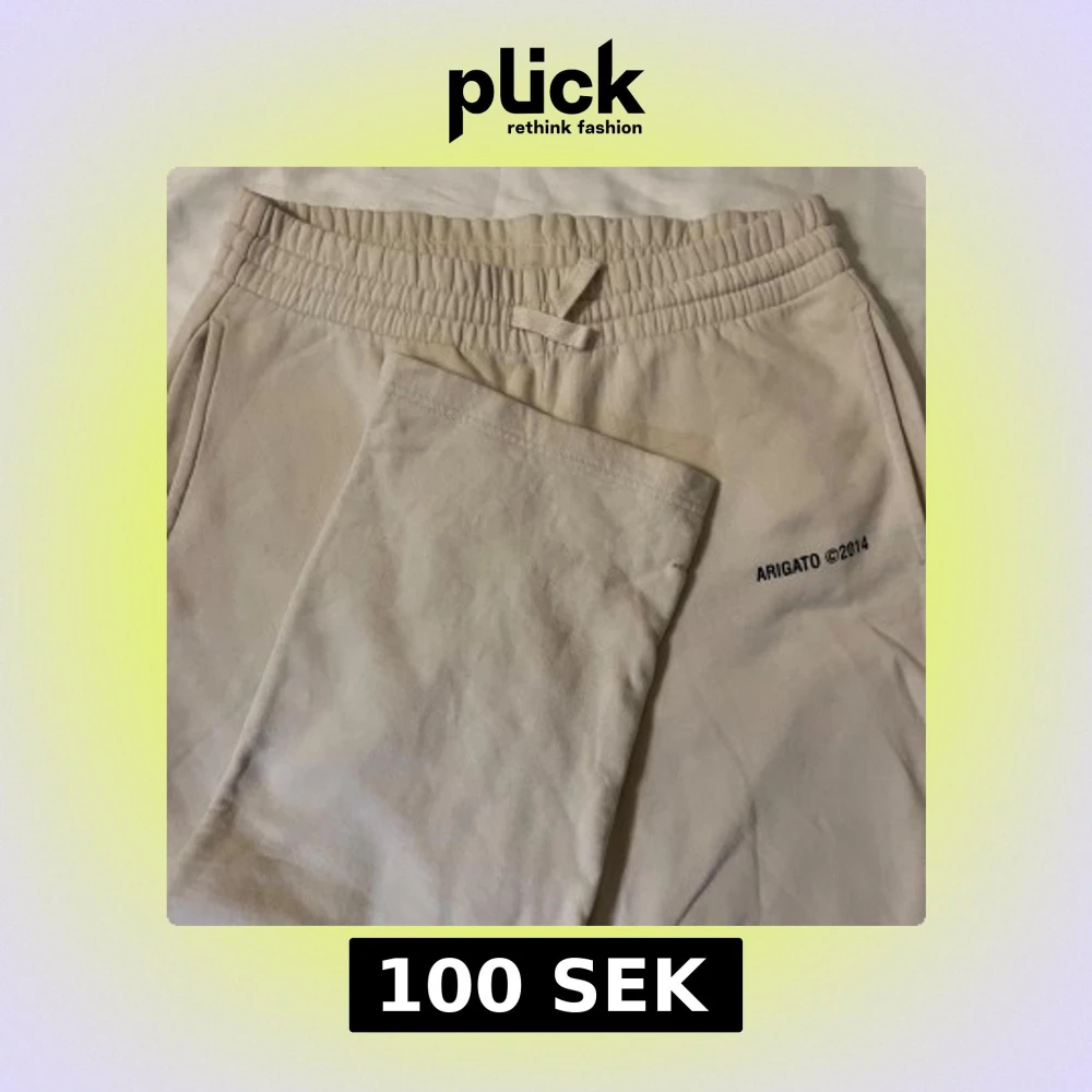 Säljer ett par bekväma beige mjukisbyxor från Arigato med elastisk midja och snörning. Byxorna har en avslappnad passform.