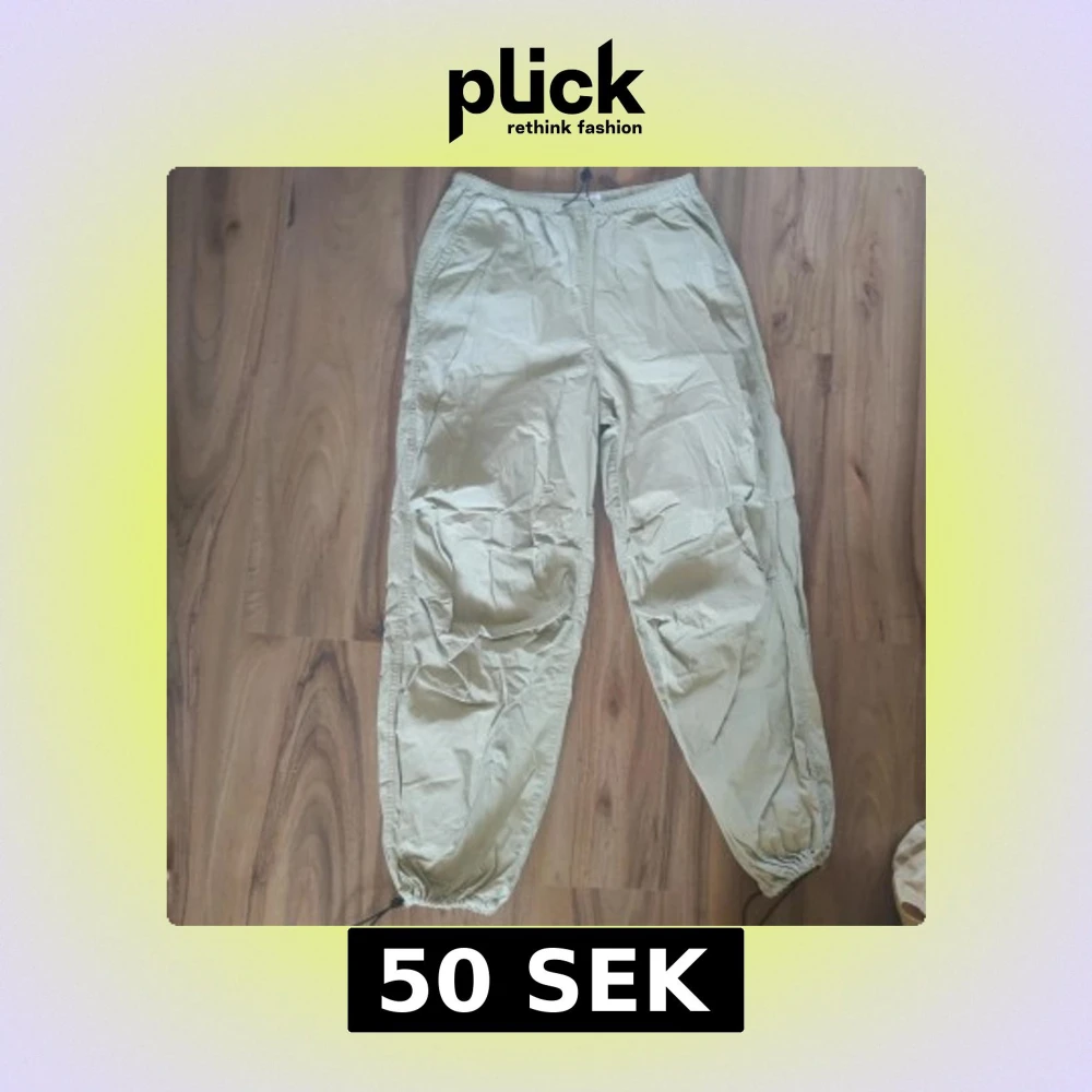 Snygga beige cargopants från H&M Divided i storlek XS. Byxorna har elastisk midja och snörning vid bensluten för en cool look. Tillverkade i lätt polyester, med fickor både fram och bak. Perfekta för en avslappnad streetstyle.