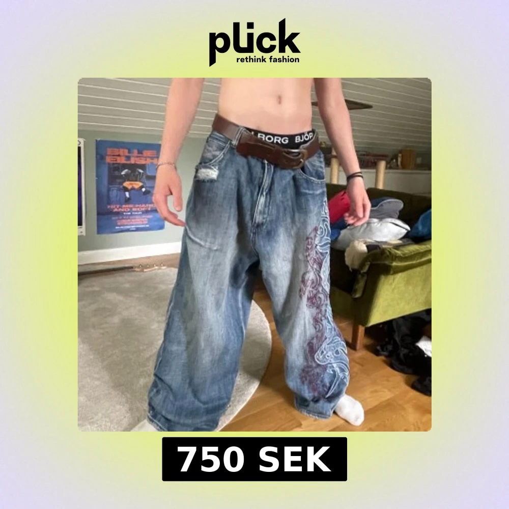 Säljer ett par jeans från jaded med broderat cyber mönster längs ena benet. Jeansen har slitna detaljer och passar alla midjemått, riktigt fräna 😽😽 priset kan diskuteras!