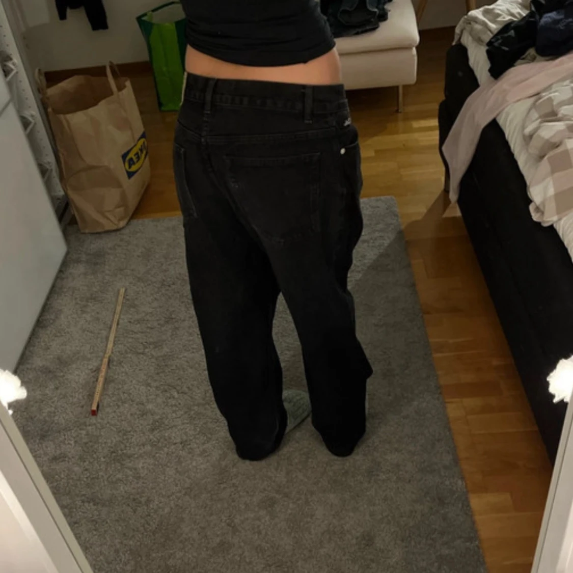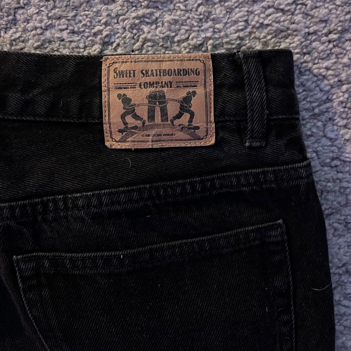 Ett par snygga svarta baggy jeans från sweet SKYBS, lite slitna där nere men men annars i bra skick. Midjamåttet är 40,5cm rakt över, utterbenslängden är 97cm och innerbenslängden är 69cm. Kontakta för mer information, pris kan diskuteras