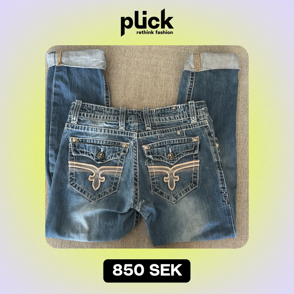 Säljer ett par snygga blå jeans från Rock Revival med coola broderade detaljer på bakfickorna😻 dom har små defekter och hål men ingenting man lägger märke till, skriv om ni vill ha bild på dom🙏sitter baggy