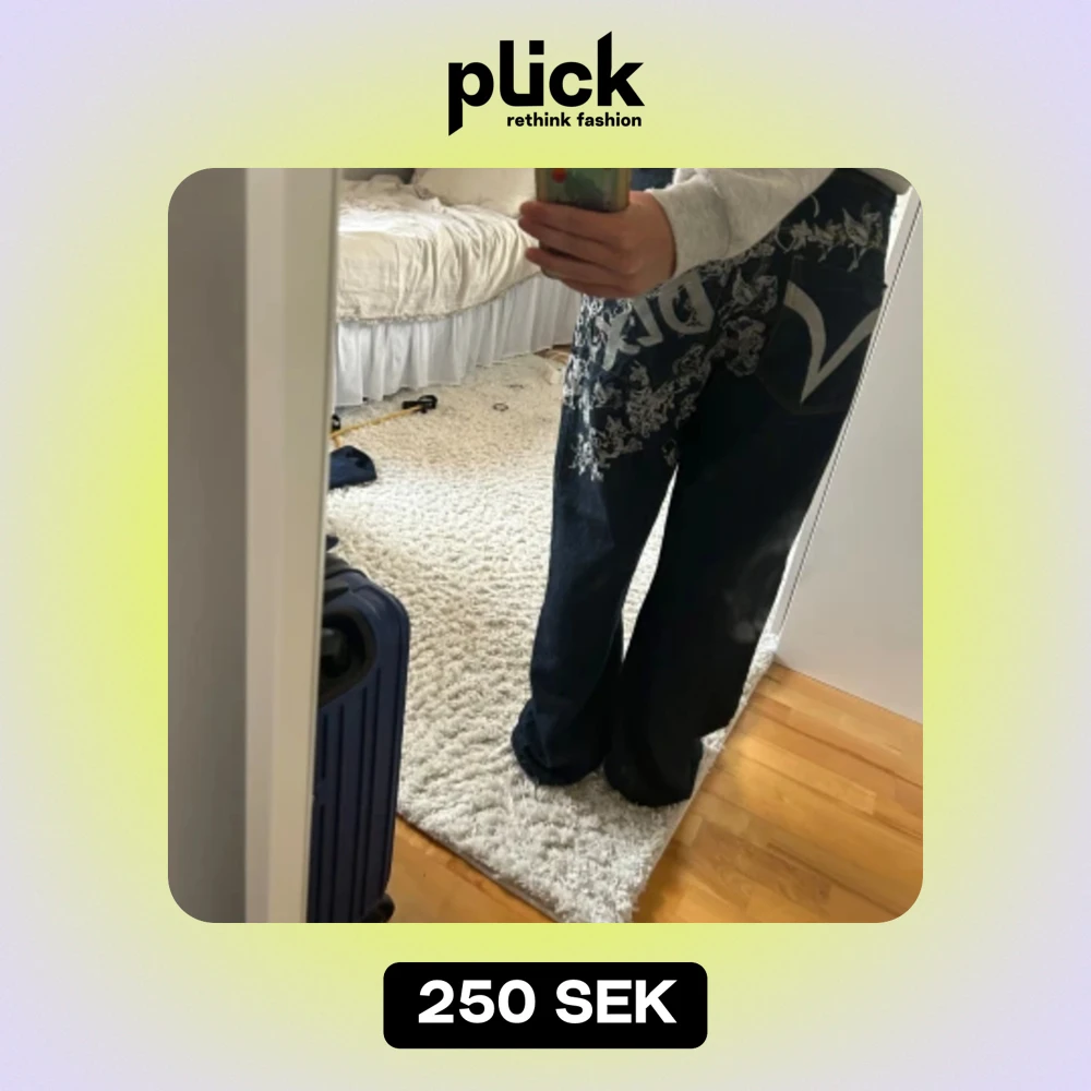 Jätte coola jeans som tyvärr inte kommer till användning! Köpta på Plick, aldrig använda av mig! Står ingen storlek men dem är väldigt stora på mig som vanligt vis har storlek 36 o är 168cm lång! Trycket är broderat