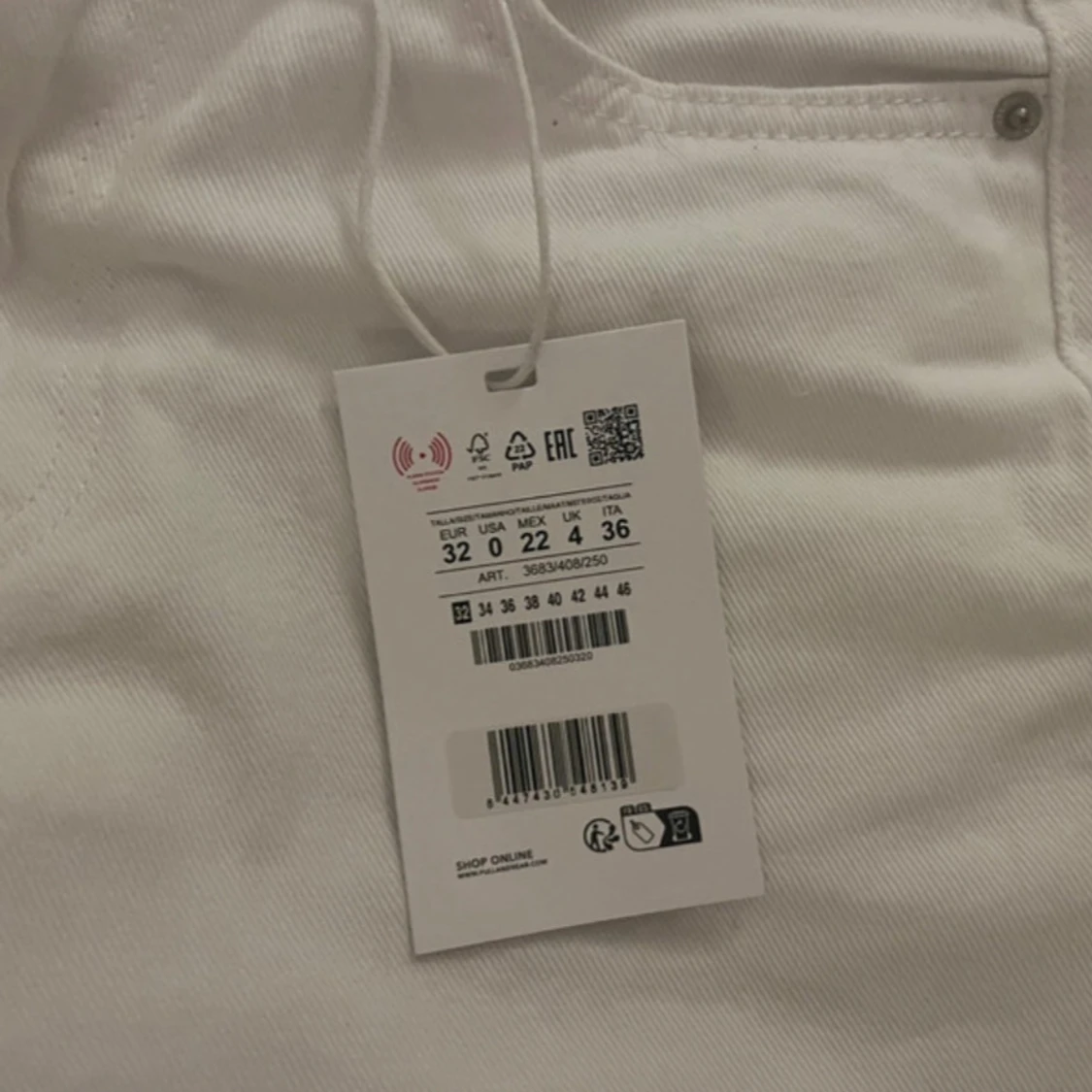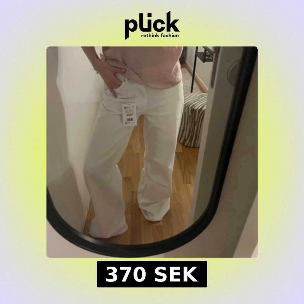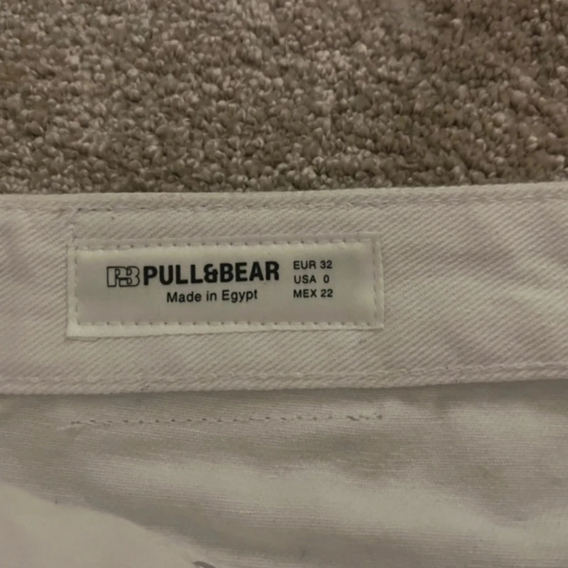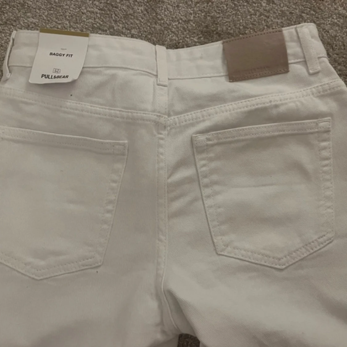 Säljer ett par vita baggy jeans från Pull&Bear i storlek 32. De har en avslappnad passform, raka ben och klassiska femficksdetaljer. Jeansen är tillverkade i bomull och har bälteshällor samt dragkedja och knapp framtill.