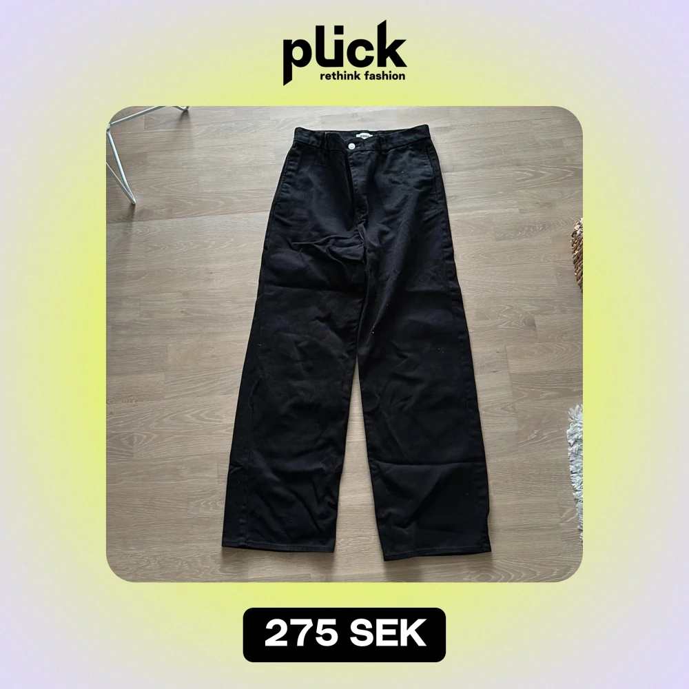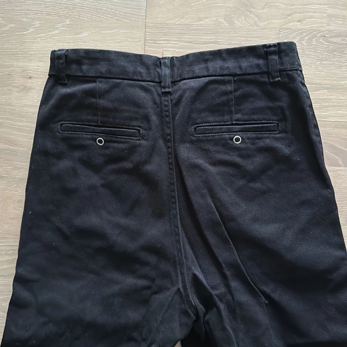 Säljer ett par svarta byxor bra skick. De har en loose passform och är tillverkade i ett robust material. Byxorna har en hög midja och stilrena bakfickor med knappdetaljer. Strl 46