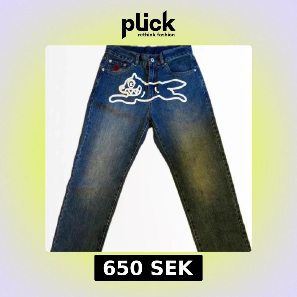 BBC Running Dog Jeans med motiv framtill. Perfekt skick, som nya. Passar ungefär som W30/L32.