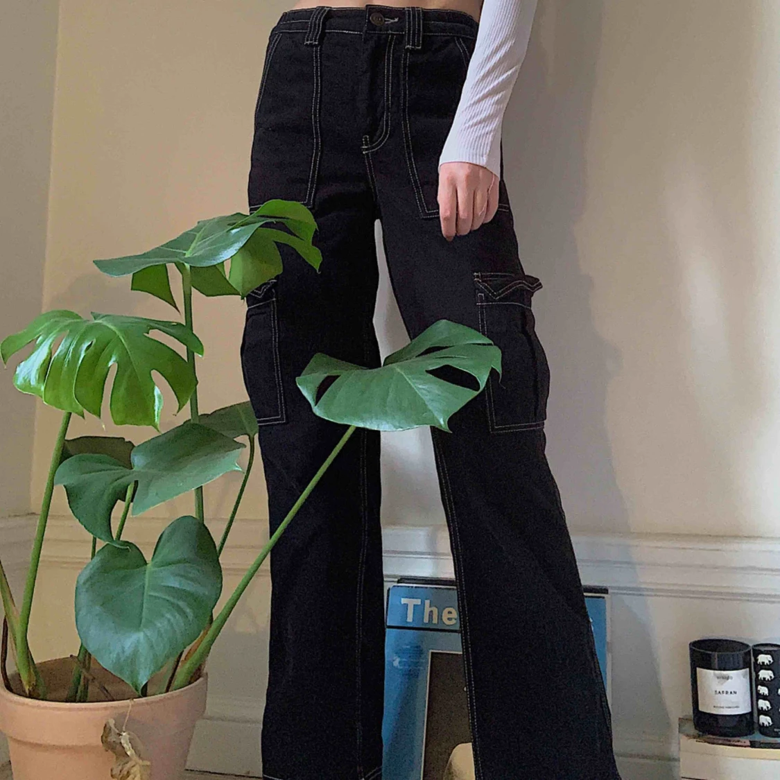 Såå fina work wear/cargobyxor i svart med vita sömmar!! Knappt använda, säljs fortf i butik💓