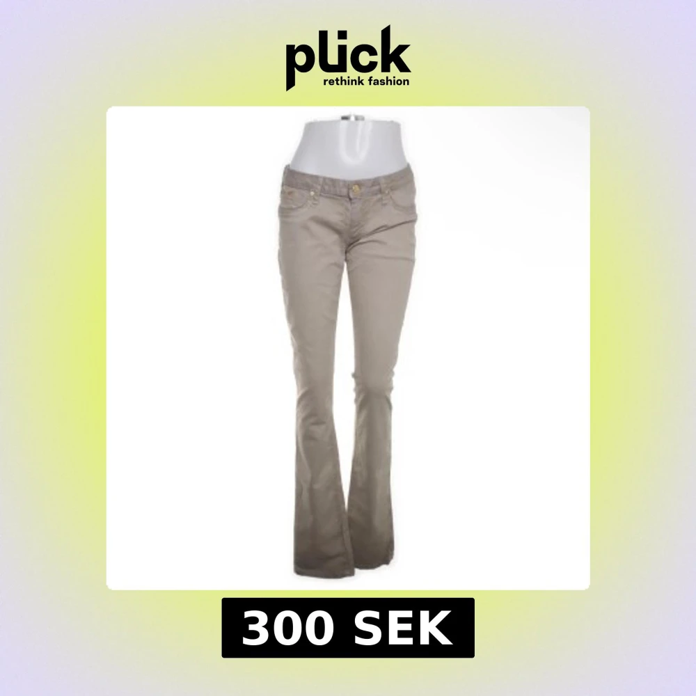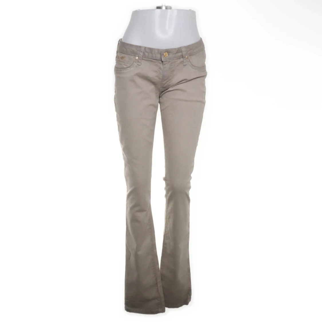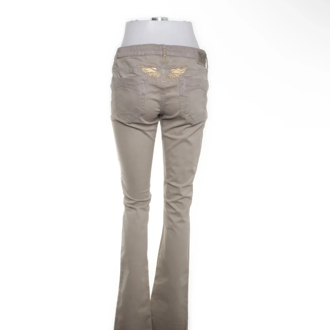 Snygga beiga bootcut-byxor med guldigt broderi av vingar på bakfickorna. Byxorna har klassisk femficksdesign, låg midja och stängs med knapp och dragkedja. Perfekta för dig som vill ha en cool och unik detalj på dina byxor.storlek w31 skulle säga en Medium!