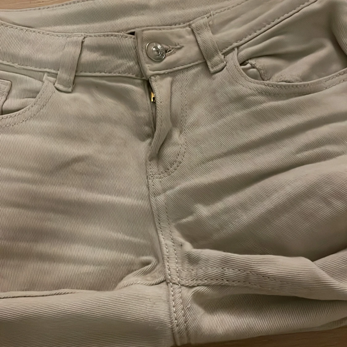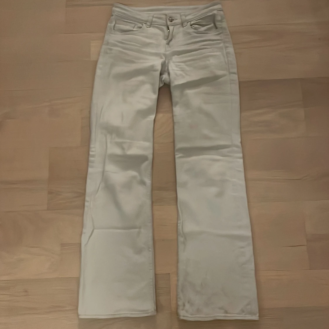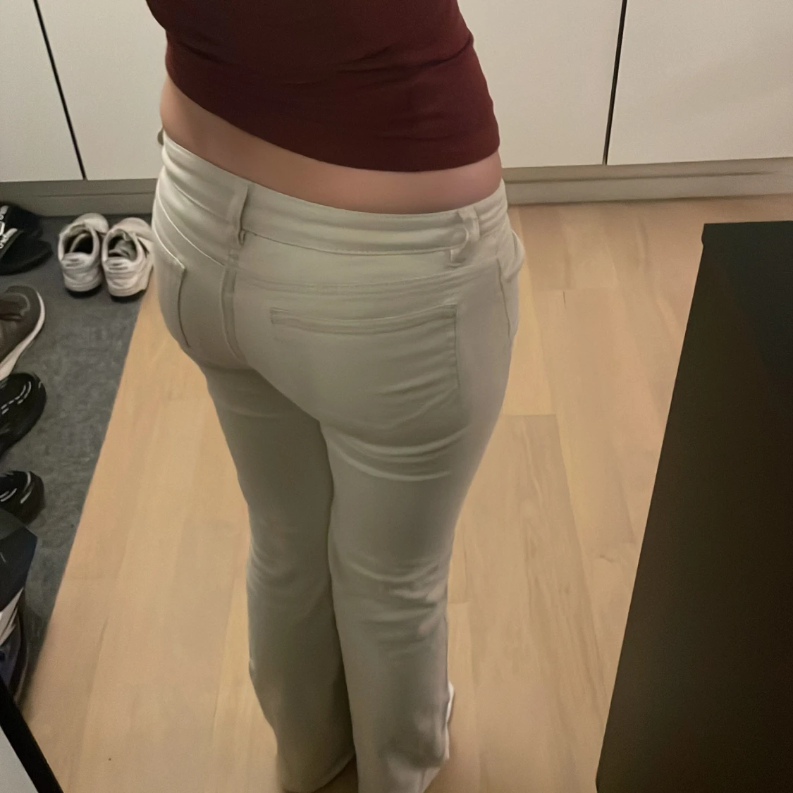 Säljer ett par snygga beiga byxor med bootcut och låg midja. De har klassisk femficksdesign, dragkedja och knapp framtill. Materialet känns mjukt och perfekt till hösten😍Innebenslängd = 76,5 Midjans omkrets = 72 cm