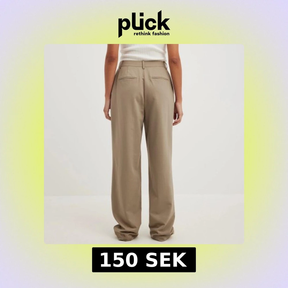 Hej! Säljer ett par beiga / bruna kostymbyxor med raka ben och pressveck. Byxorna har hög midja och är raka i passformen. Från NAKD i stl S🤎