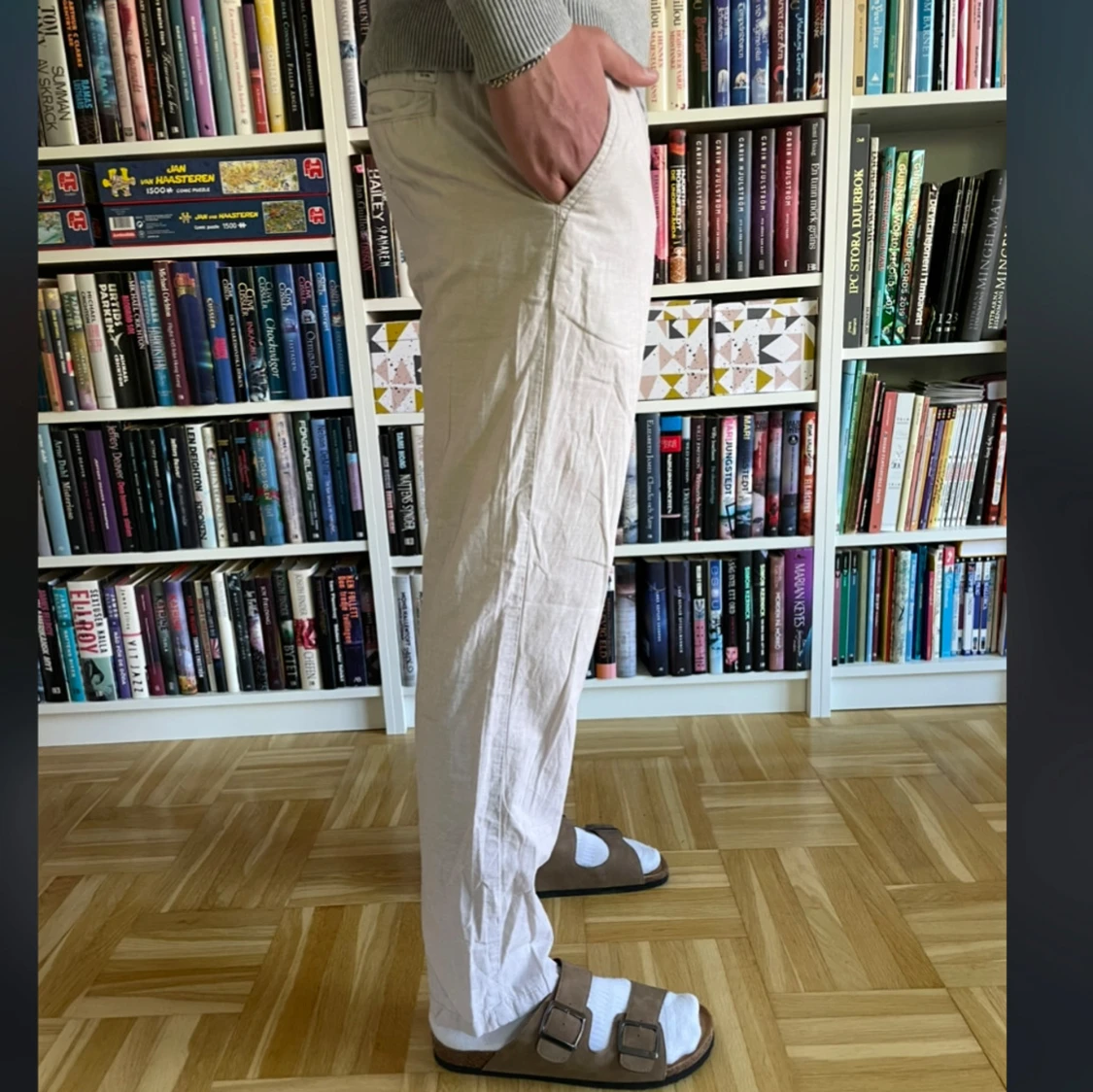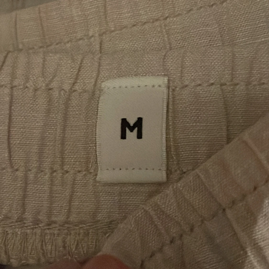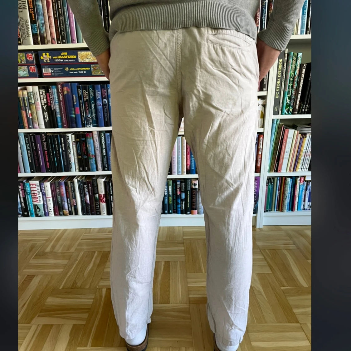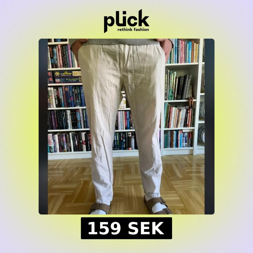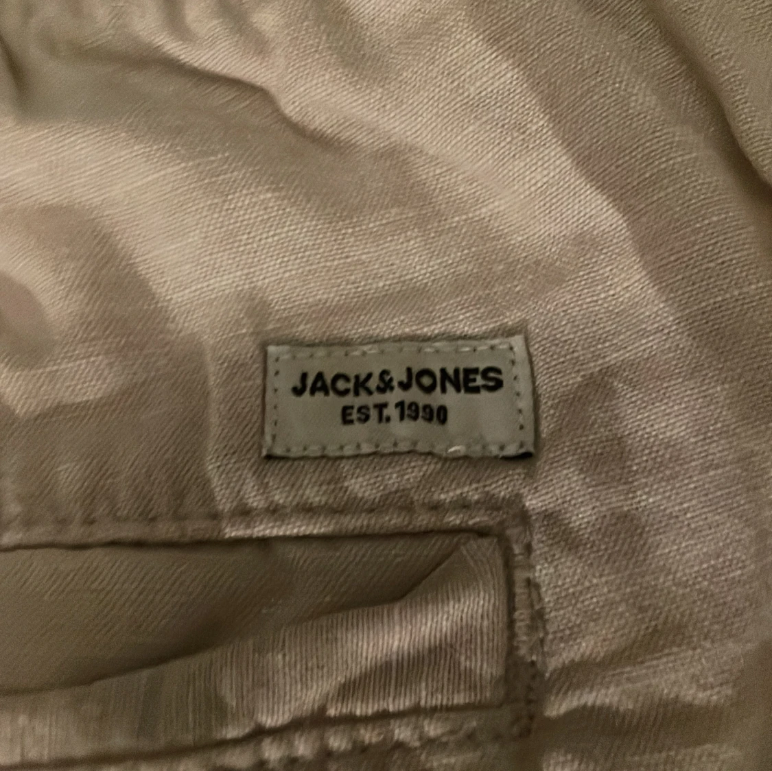 Säljer ett par beiga linnebyxor från Jack & Jones med normal passform och raka ben. Byxorna har midja med resår och är tillverkade i ett lätt bomullsmaterial, perfekta för vår och sommar. ☀️