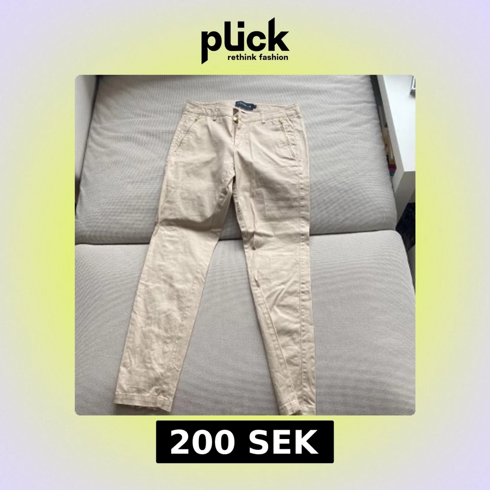 Snygga beiga byxor från Stockhlm med normal passform och raka ben. Byxorna har fickor fram samt stängs med dragkedja och knapp. Perfekta till vardags och enkla att matcha med olika toppar. (För små för mig)